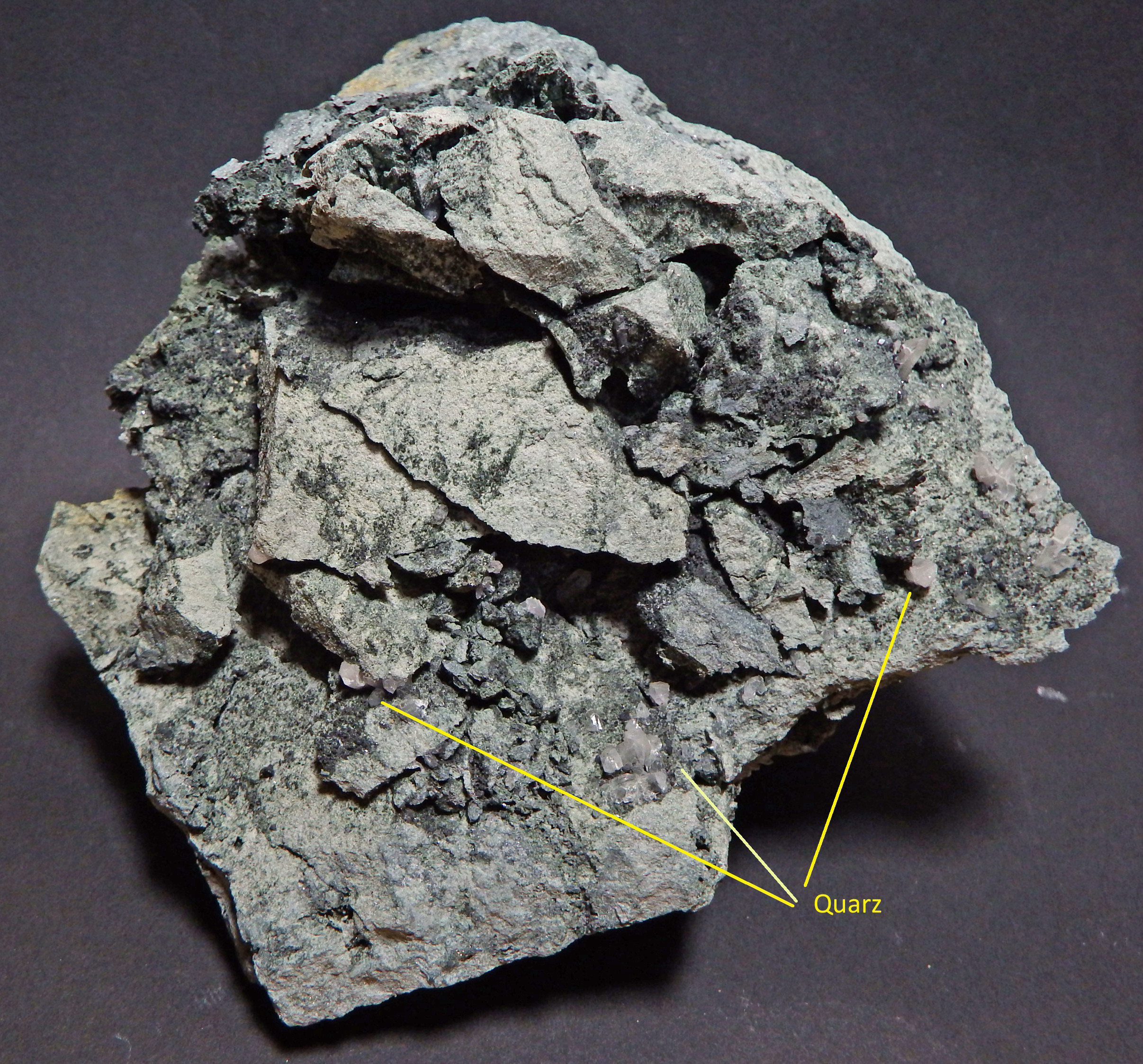 Hier ein Foto eines Diabasstücks, 10 mal 10 cm auf den markierten Stellen ist Quarz zu erkennen.