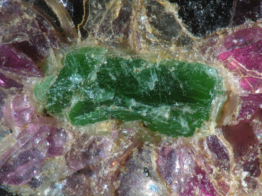 Und auch, weil der x im Pyrop eingeschlossen ist - das ist beim Cr-Diopsid relativ üblich (wie z.B. auch in Wanzenau, vgl.: https://www.mineralienatlas.de/forum/index.php/topic,10815.msg104195.html#msg104195), wäre aber für Pyroxen - zumindest meiner Erfahrung nach - eher ungewöhnlich.