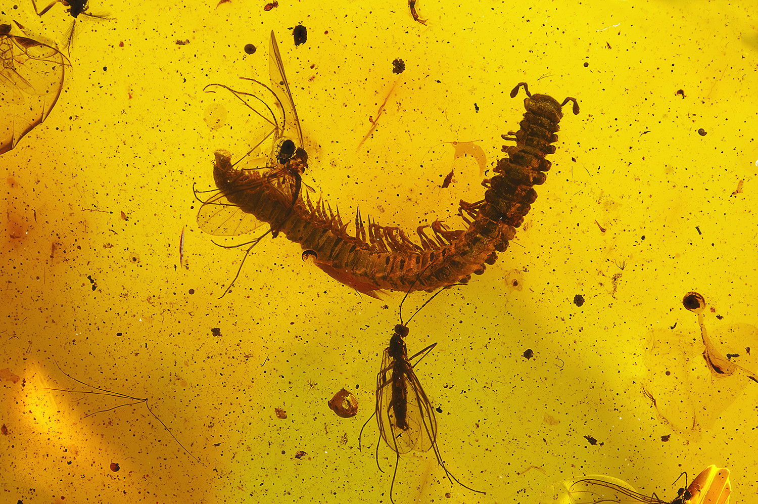 Ich habe gerade dieses wunderschöne Foto von Karlheinz Grosch von baltischen Bernsteinfossilien entdeckt. Grob zugeordnet sind leider nur die Fliegen (Leia). Auch ich bin Laie, was Insekten betrifft - mich erinnert der Tausendfüßer aber stark an rezente Vertreter der Bandfüßer (Polydesmida). Liege ich da richtig ?