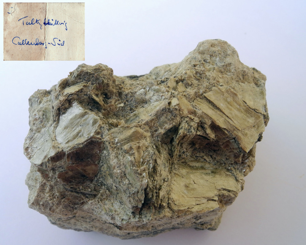 Die Lage mit blättrigem Talk ist ca. 2 cm stark, darunter folgt zersetzter Serpentinit (?).