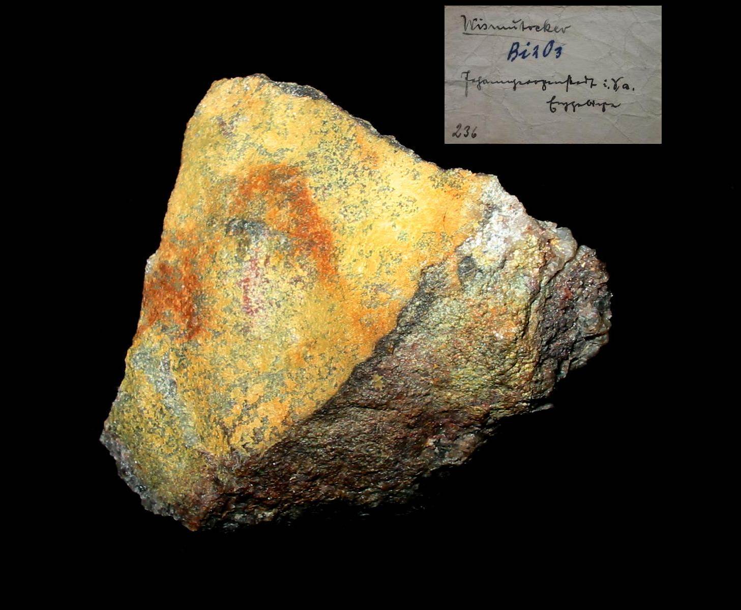Die Halde der Grube Himmelfahrt ist bekannt für Russelitfunde. Allerdings wäre bei dieser Großaufnahme Russelit optisch nicht zu erkennen. Unterm Bino lassen sich Russelitkrusten jedoch recht gut von Bismitkrusten unterscheiden. Allerdings kann, zugegebenermaßen, eine visuelle Bestimmung immer angezweifekt werden.