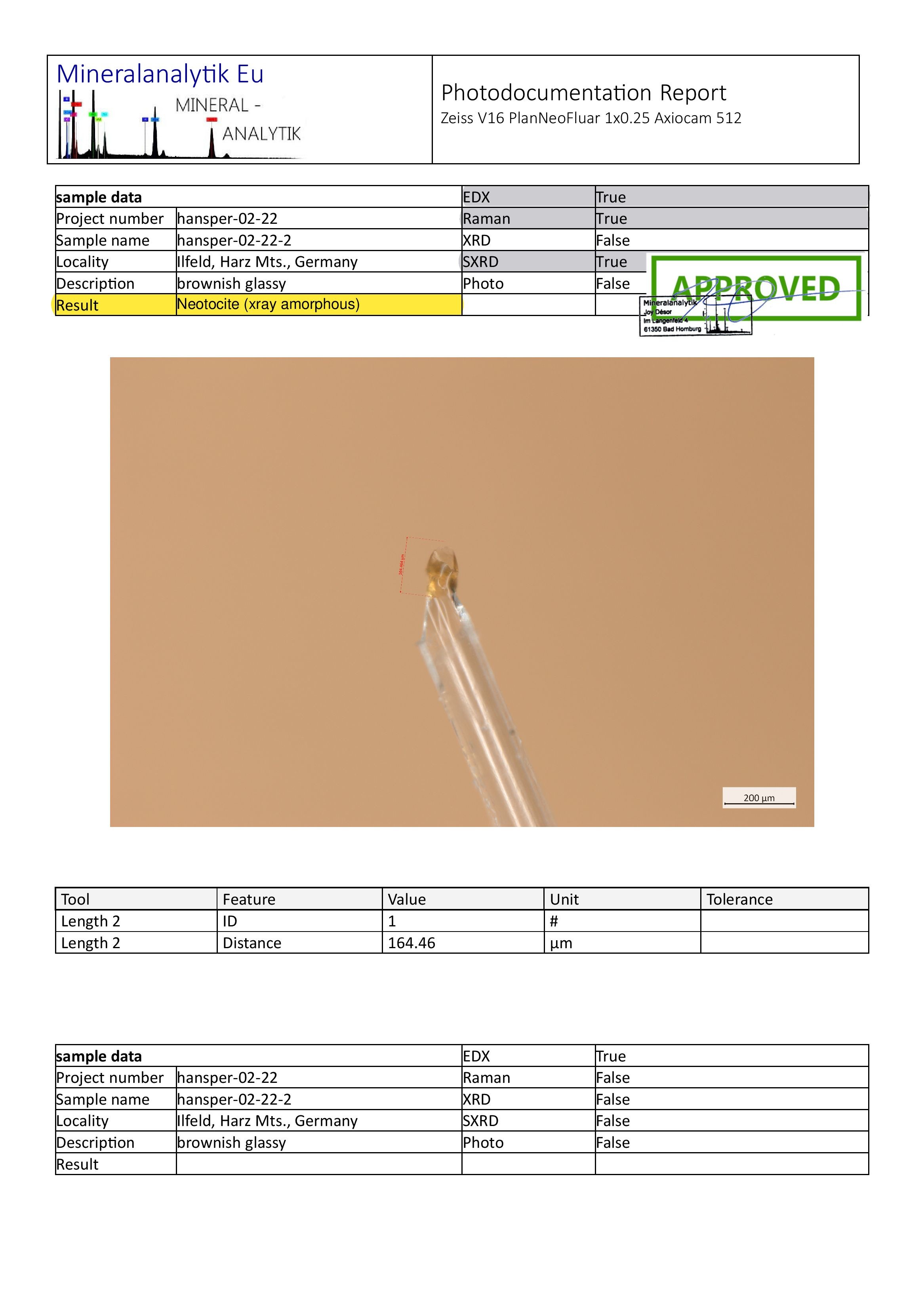 Ja schon, aber dann kann man doch nicht schreiben „analysiert mit SXRD“. Das hat zur Erkenntnis nur beigetragen, dass das Zeug röntgenamorph ist, aber doch nichts zur Mineralzuordnung. Dann muss man schreiben „analysiert mittels EDX und Raman“. Das Bild kann man ja trotzdem verlinken…