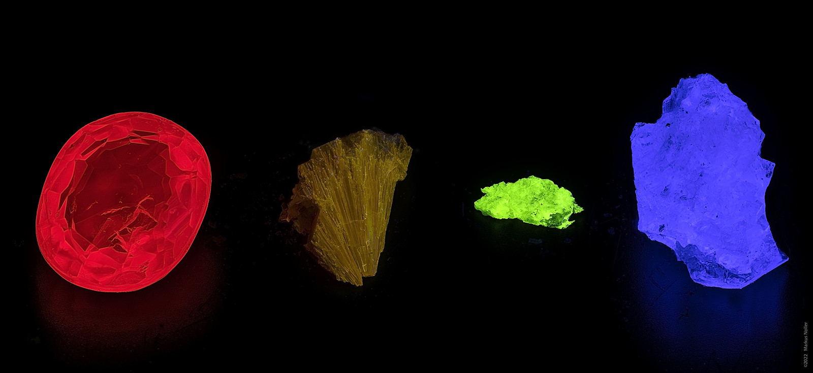 Fotografiert die Lumineszenz eines Rubins in einem Bild zusammen mit einer blauen Lumineszenz (Fluorit), einer grünen (Uran-Mineral oder Willemit) und einer orangeroten (Sodalith). Und zwar so, dass der Farbeindruck des Rubins und gleichzeitig mindestens die Grüntöne stimmen.