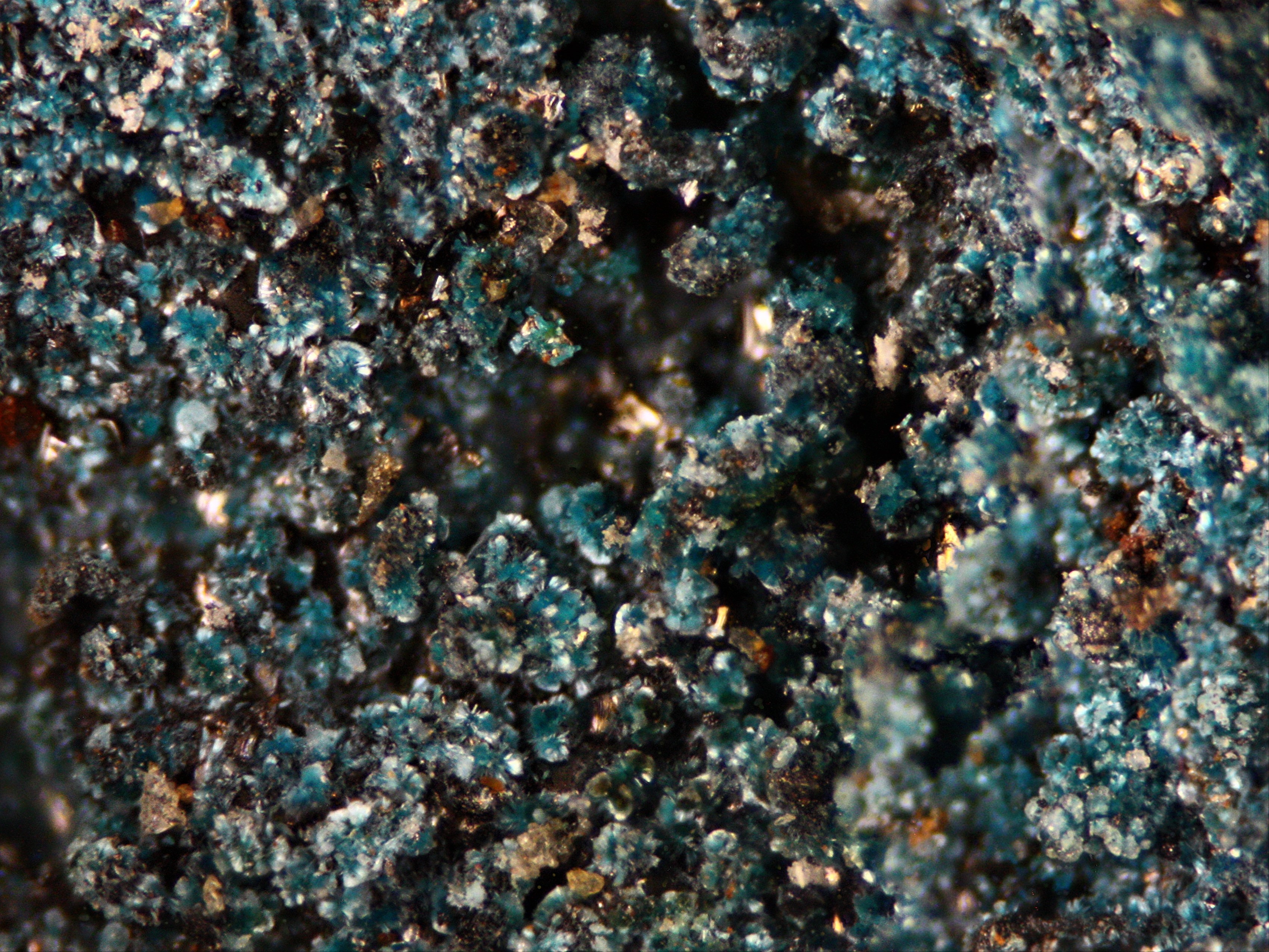 Foto 1: Das "Maklit" Foto aufgehellt. Da sehe ich blaue nadelige, radial angeordnete Connellit Büschel.