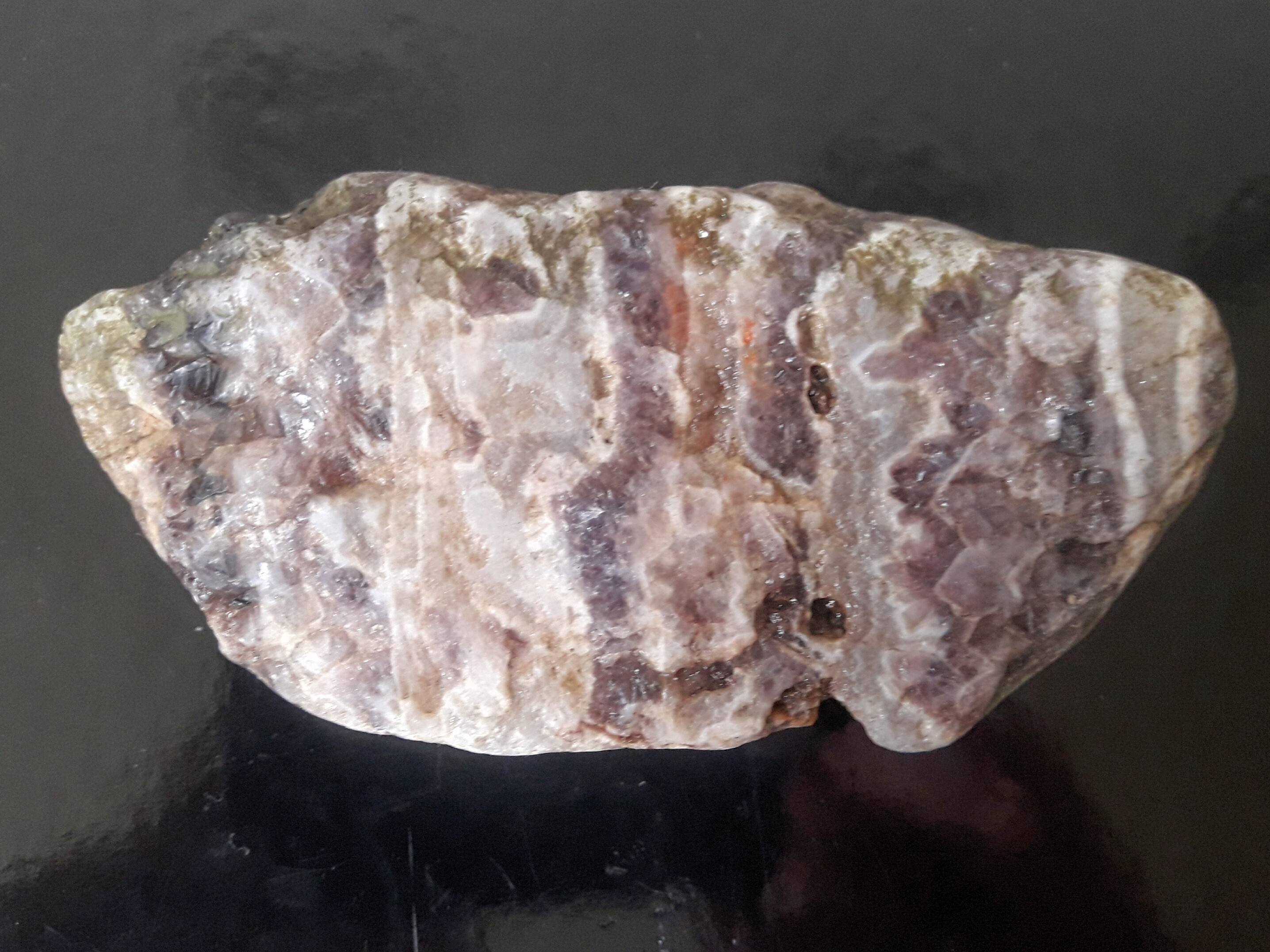 Auch bei diesem Stück sehr ich weitaus überwiegend makrokristalline Quarzvarietäten, weswegen ich es als gebänderten/zonar aufgebauten Amethyst bezeichnen würde - eine Zuordnung zu Achat finde ich problematisch ...