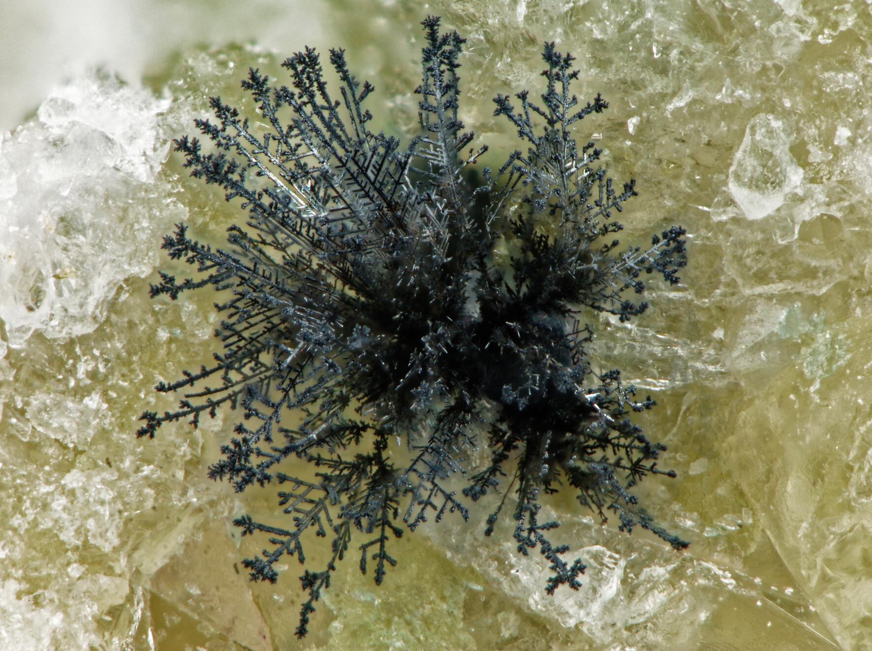 Cu-Sulfid in jedem Fall, aber eine Zuordnung ist nicht einfach. Eher Digenit als Covellin, aber eine Zuordung solcher Aggregate ist schwierig, zumal es eine Reihe von Cu-Sulfiden gibt. Ein einfacher Test auf Covellin ist das Benetzen mit Öl. Während Digenit und viele andere Cu-Sulfide (Spionkopit, Yarrowit, Djurleit, Geerit etc.) keine Farbveränderung zeigen, erscheint Covellin unter Öl in rosaviolett. Bitte immer ein kleines Aggregat abpräparieren und daran teten, das Öl bekommt man nicht von der Stufe runter. Zur genauen Bestimmung bleibt nur Analytik.