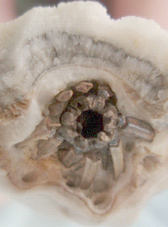 b) "durchdrungen" ? war das nicht eher so, dass sich der Aragonitsinter um das pflanzliche Objekt herum gebildet hat?