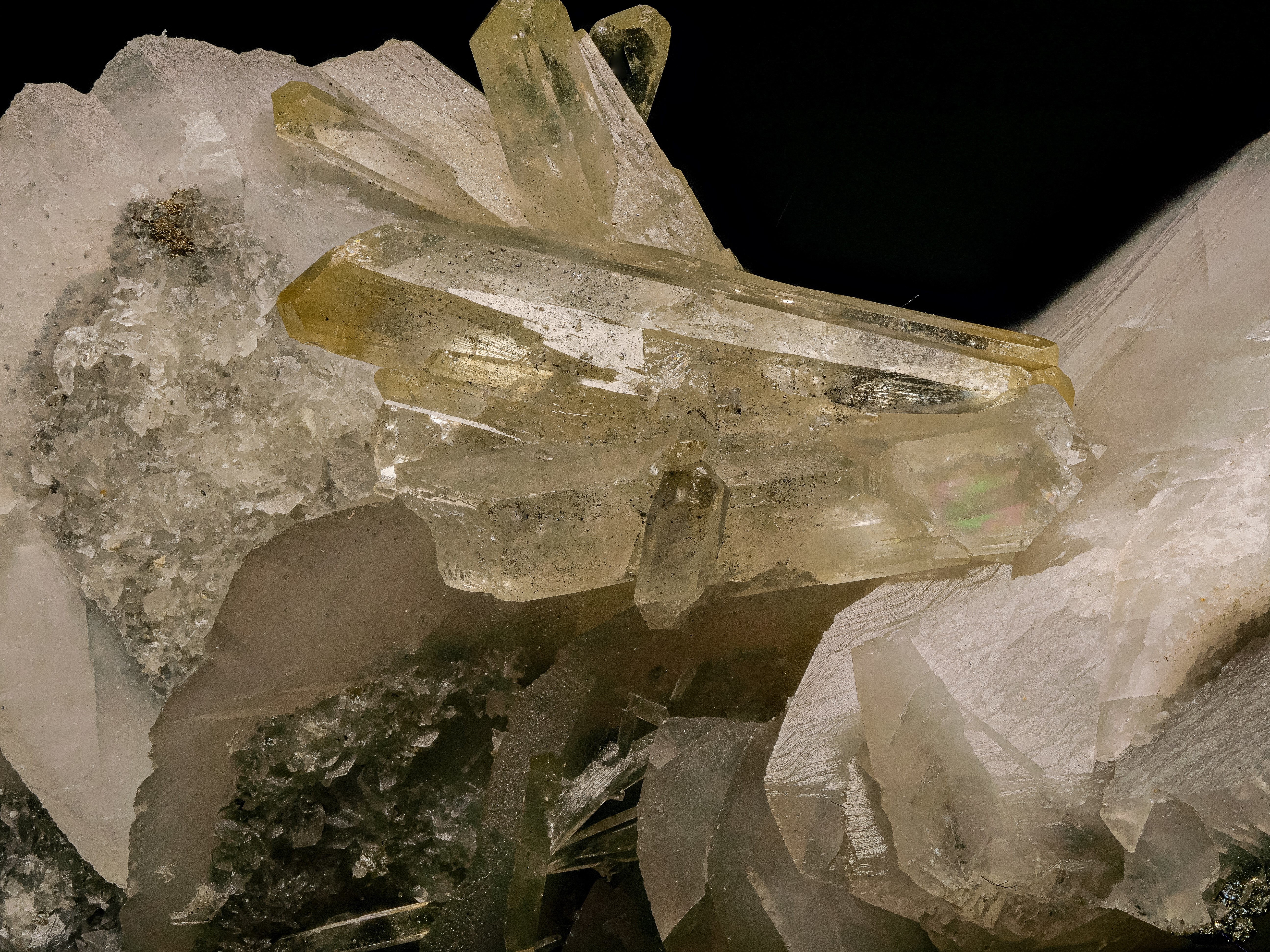 ich vermute es handelt sich hierbei um gelblichen Baryt auf Calcit. Bruch (mittig auf dem Aggregat), Kristallform und Streifung (siehe weiteres Bild der Stufe) sprechen gegen Calcit.