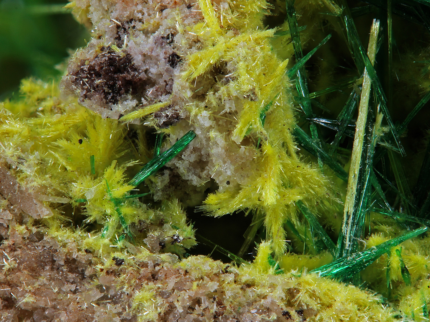 feinnadeliger gelber Sklodowskit.....ngeligem grünem Cuprosklodowskit