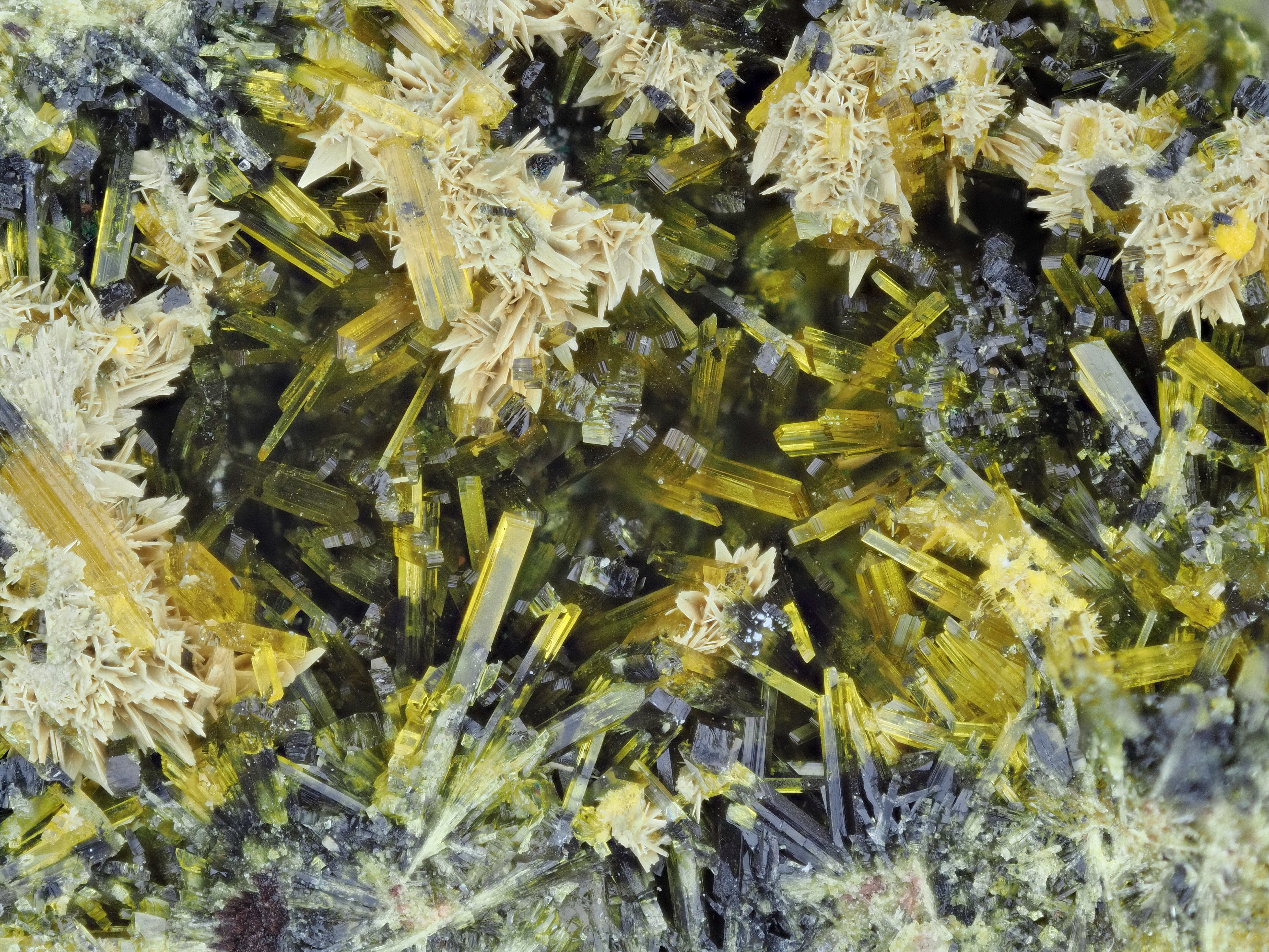 der Sklodowskit ist nicht analytisch gesichert, ich habe bislang auch keinerlei Zweifel an seiner Identität gehabt, da er optisch verglichen mit allem mir zur Verfügung stehenden Material ähnelt. Die partiell dunklere Farbe stammt vermutlich von geringen Kobaltgehalten, wie sie bei Sklodowskit von Musonoi vorkommt (Wilson, et al.2018, im MinRec Vol.49,Nr.2 S.290f.). Eine optisch vergleichbare (und analysierte) Probe von solchem Co-haltigen Sklodowskit habe ich mal vor Jahren von Dr.Thomas Witzke erhalten. Ein mieses Belegfoto davon findet sich unter "Oursinit" im Lexikon. Das Foto sollte ich mal gegen ein besseres aus der Neuzeit auswechseln.