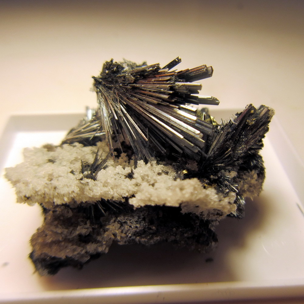 hbiecker_02  BB: 8mm, Stibnit auf Quarz, Fundort: Auvergne,  La Forge Mine, Eigenfund von 1994