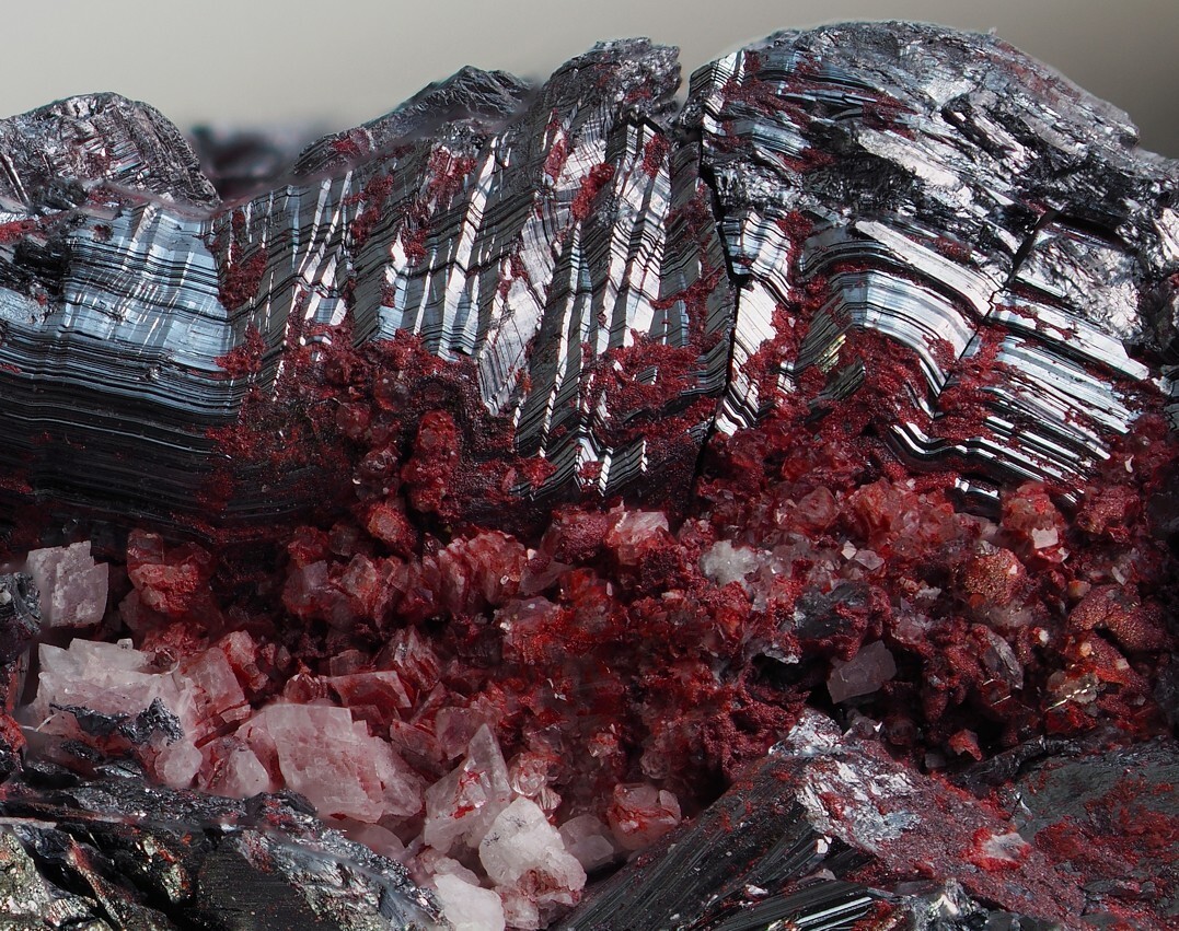 Klaus 2: Gestauchter Antimonit und roter Metastibnit aus der Antimongrube von Stadtschlaining