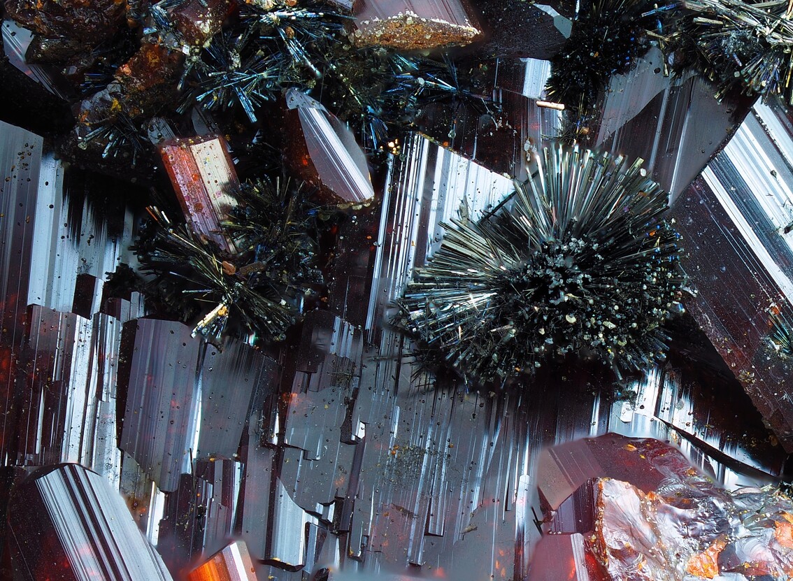 1) Stibnite von Le Dahu (Haute-Loire, Frankreich). Bildbreite 4 mm