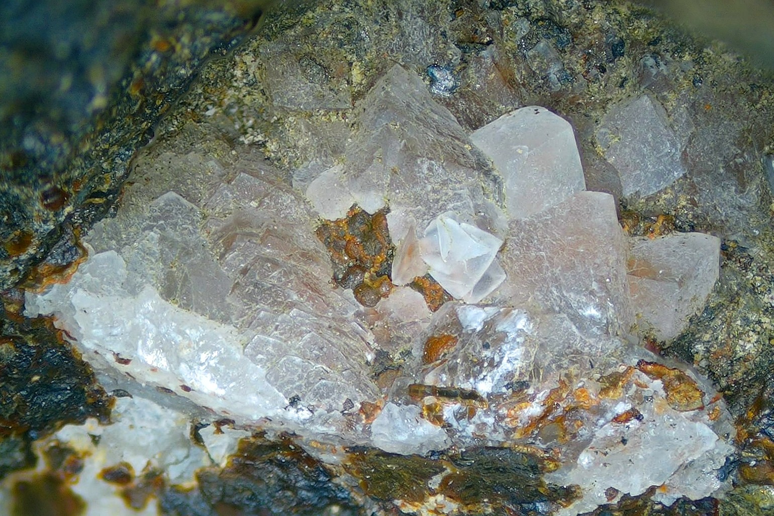 Nun hab ich den Brocken aber nochmal aufgeklopft, kleiner gemacht, und in den frischen Bruchstücken finden sich ein paar Drusenfüllungen von (eindeutig) Calcit. Da es rein visuell teilweise Ähnlichkeiten zwischen den Hohlräumen gibt hab ich die Druse, die ich (ohne Kenntnis der anderen Calcit-Drusen im gleichen Stück) bisher als Gismondin gehalten habe, nun auch mit HCl getestet, und es ergab ein Schäumen.