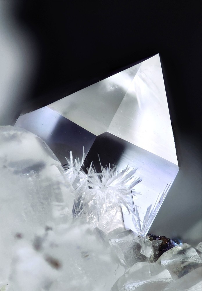 Weißer, nadeliger, noch unbestimmter Einschluss in Quarz: