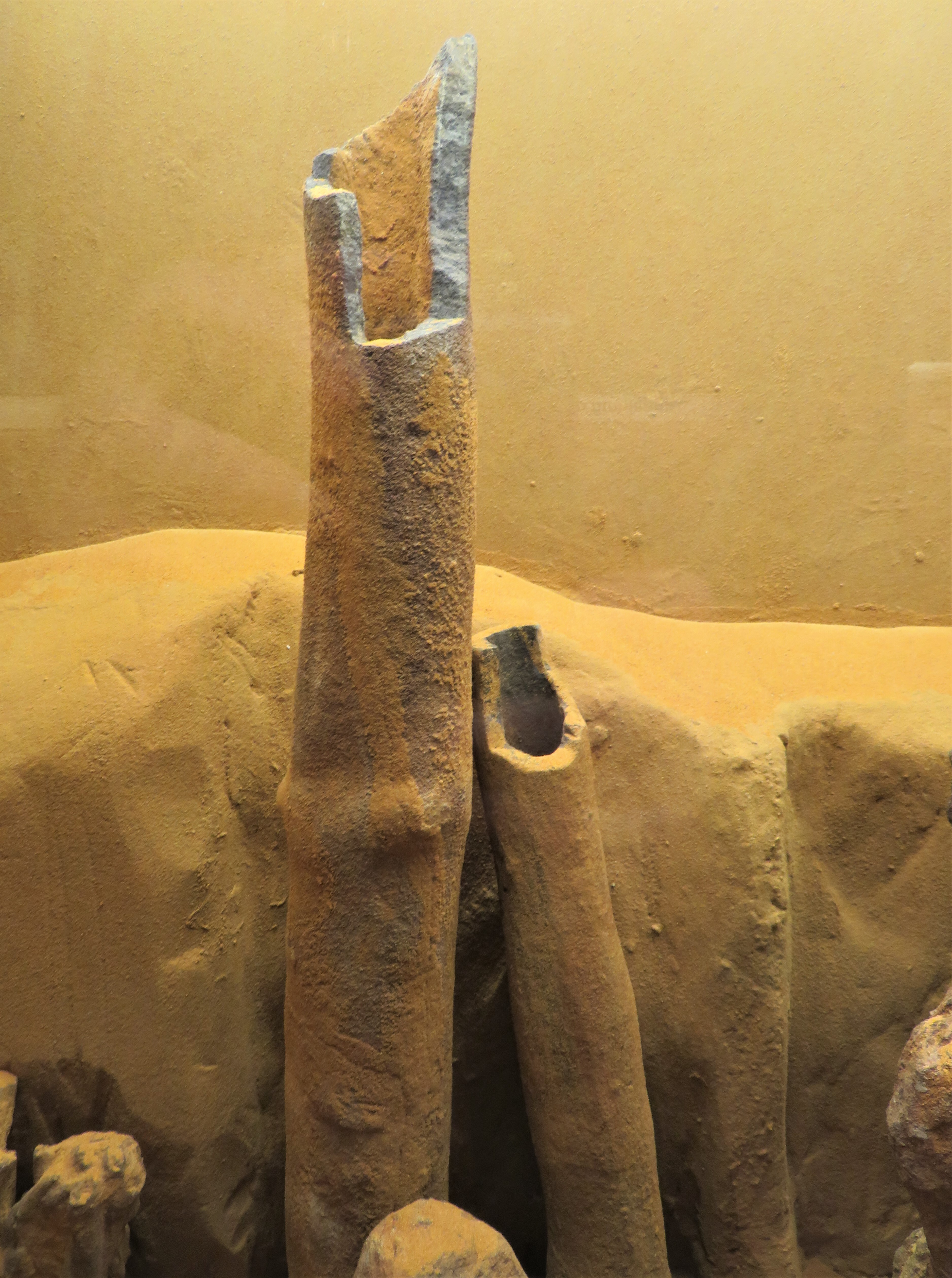 Wenn man in eine Vitrine mit Blitz fotografiert gibt es meist störende Reflexe. Deshalb verwende ich da nie den Blitz.