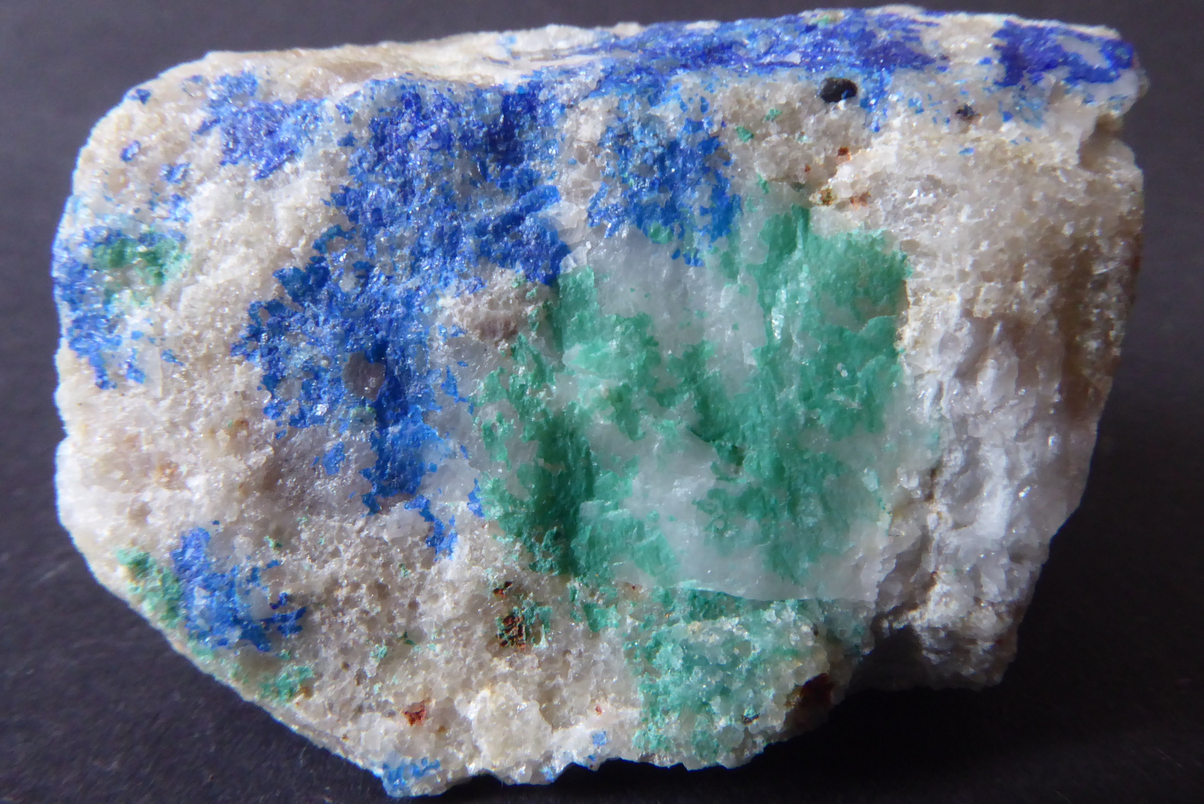 Ich kenne die Fundstelle nicht. Vom Bild her würde ich es aber auch nur als Azurit mit Malachit ansprechen. Der Glanz im grünen Abschnitt kann trügerisch sein, da der Quarz auch glänzt und die grüne Mineralsubstanz nur als Kluftfüllung im Quarz auftritt. Teils ist die grüne Mineralsubstanz an der Oberfläche, teils im Inneren vom Quarz.