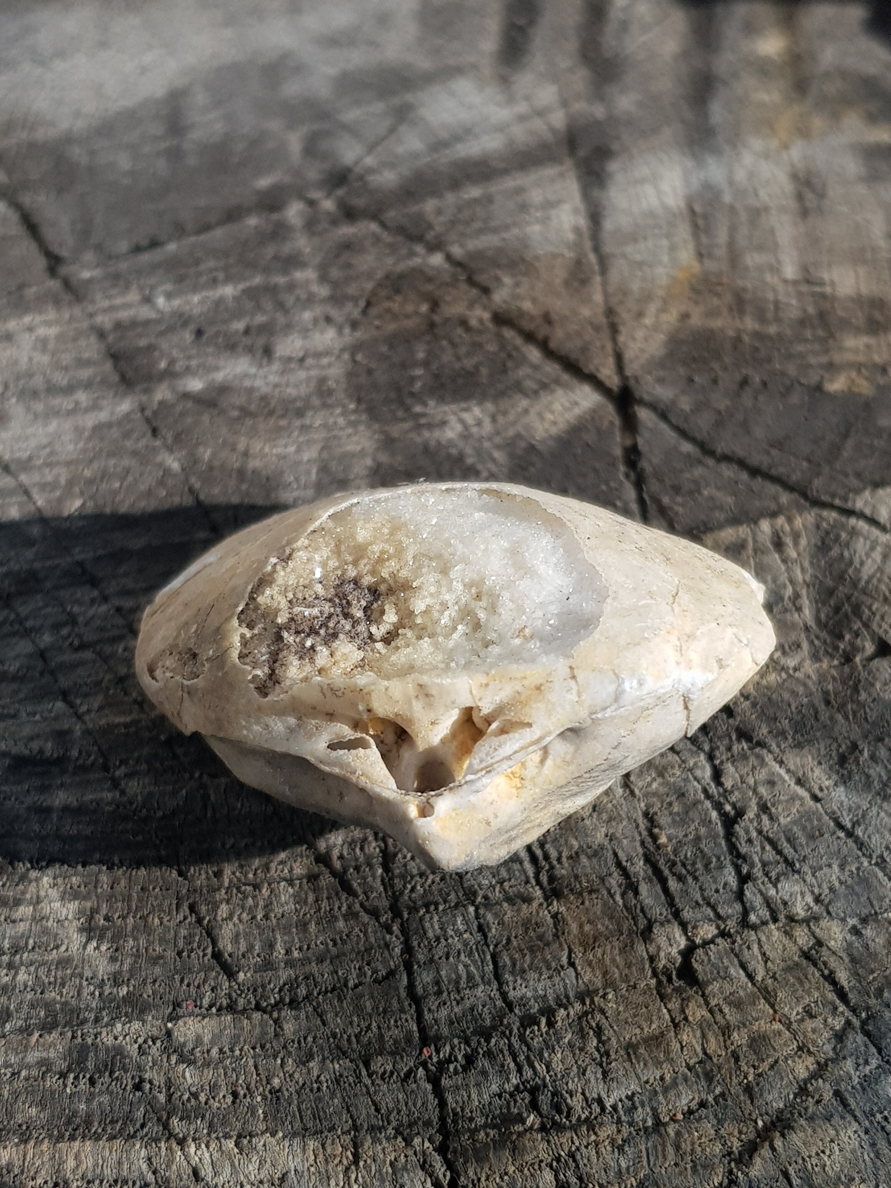 Ja, Oliver hat recht, ganz sicher Brachiopode. Sind gar nicht mal so selten und man kann sie immer mal wieder im ehemaligen Vereisungsgebiet aufsammeln. Ohne Matrix und komplett, dann meist aber abgerollt, oder wie im Bild zu sehen im Flint/Hornstein (Oberkreide / Alttertiär) verbacken. Mit etwas Glück findet man Klappen, deren Innenseiten und Armgerüste mit feinen kleinen Quarzkristallen überzogen sind.