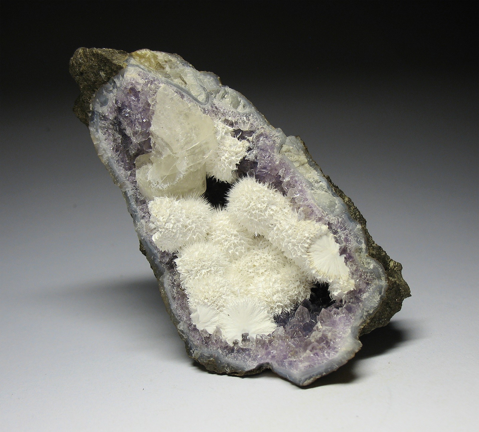 Okenit mit Calcit auf Amethyst