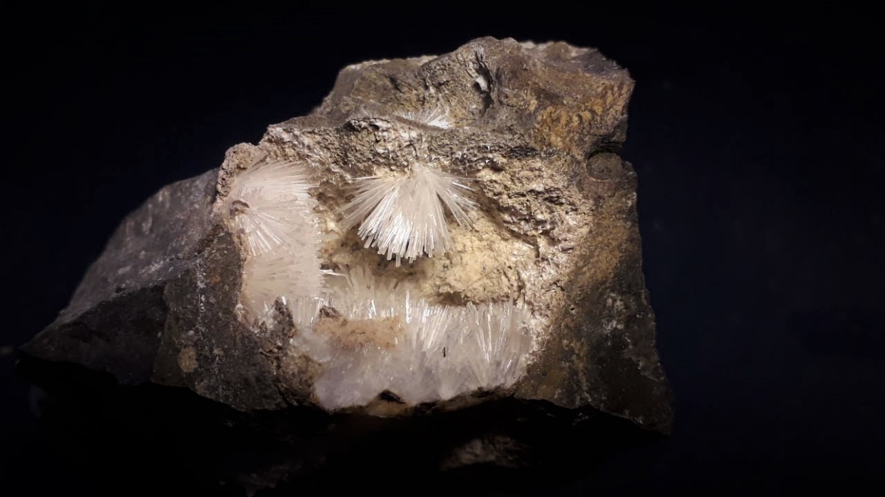 1. Calcitrhomboeder auf Aragonitnadeln, 4 x 3,5 cm