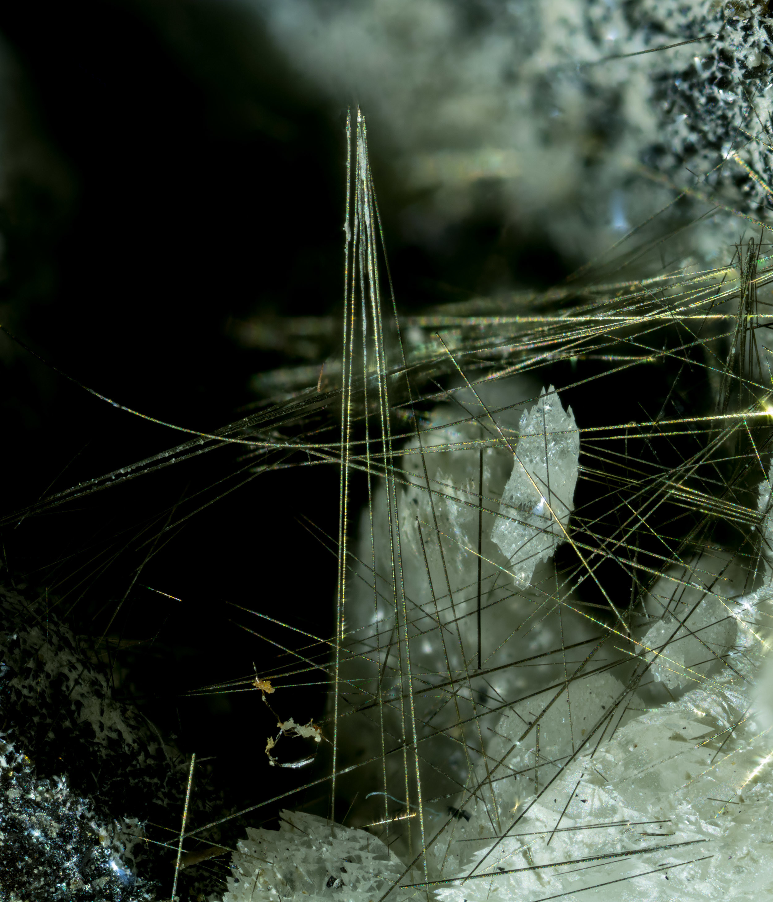 ich habe hier Millerit mit Calcit von der Grube Dörnberg, Willibaldstollen 120m-Sohle, Bildbreite 15 mm