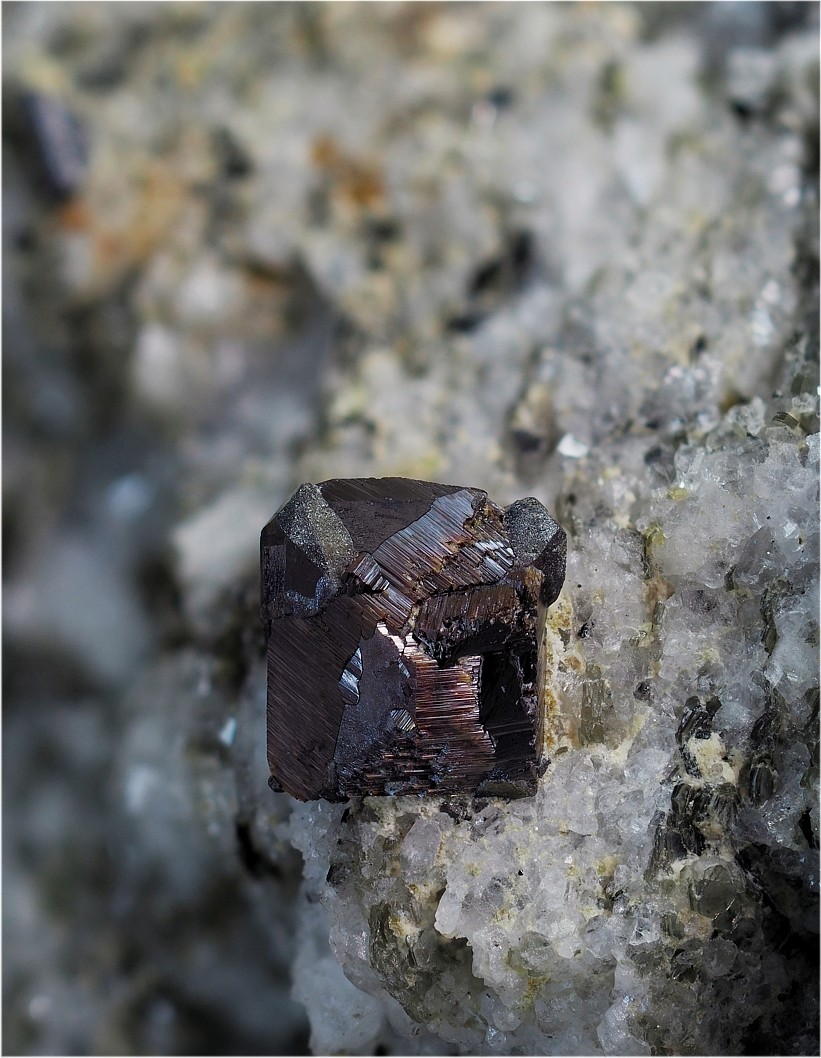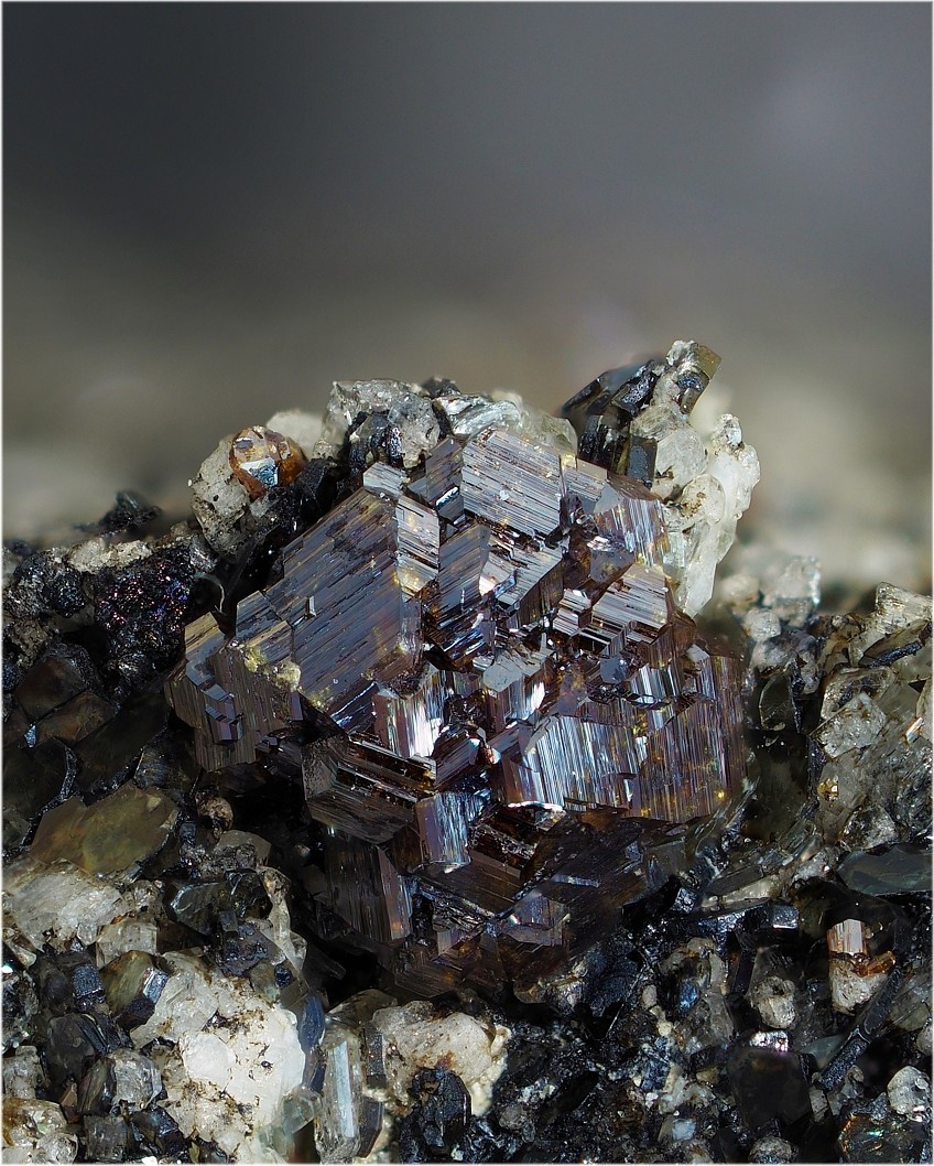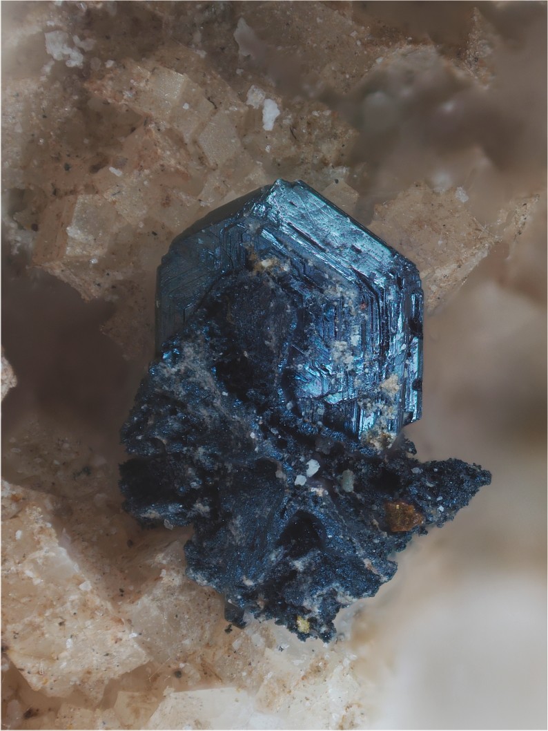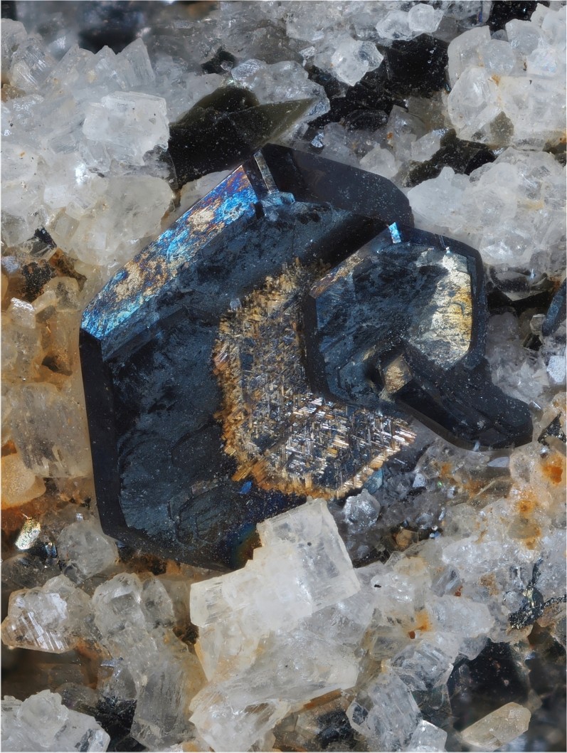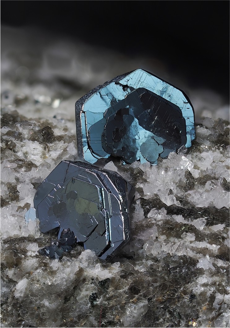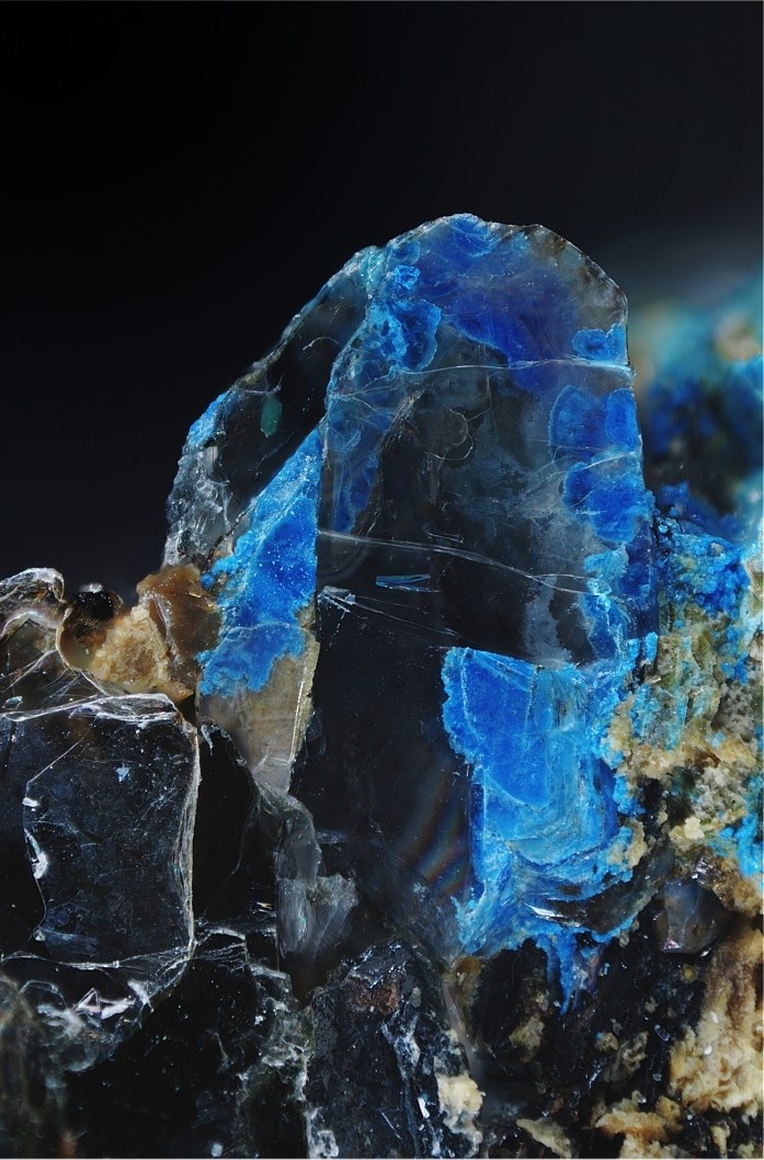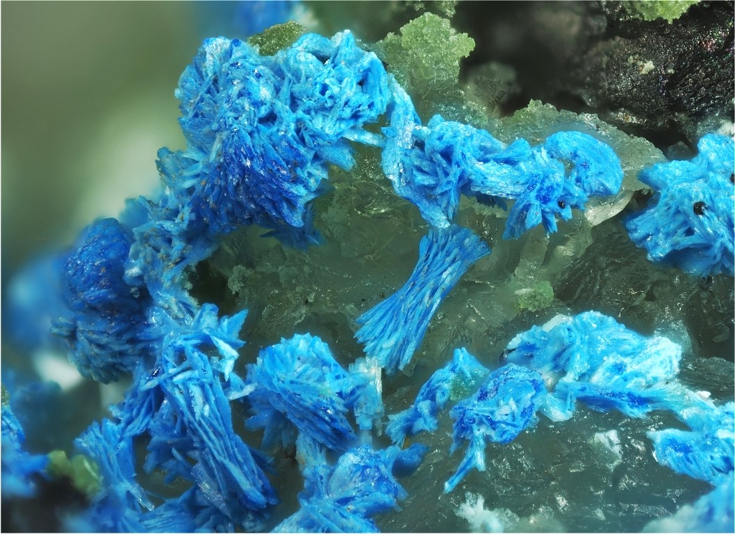 Dein Bild überzeugt jetzt durch graphische Elemente (Große diagonale Bildteilung in Grau und Blau, die gegenläufige Diagonale wird durch Formwiederholung kleinerer Elemente (schräge Kanten der Kristalle) ebenfalls ins Spiel gebracht), durch eine Drei-Gliederung in der Tiefenstaffelung von vorne nach hinten (Quarz, Linarit, Grau) und farblich durch eine interessante, vibrierende blaue Tönung der Kristalle.