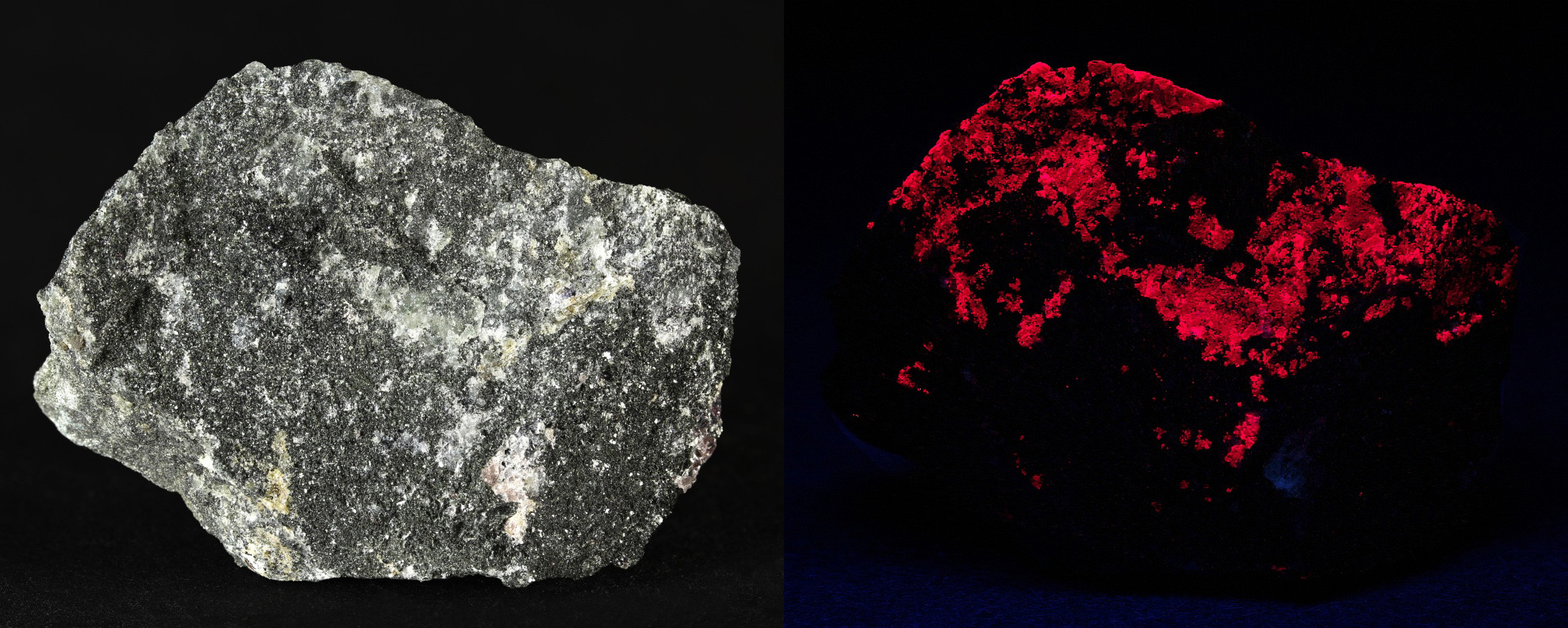 Eukryptit aus der Xianghualing Mine, Hunan, China, rechtes Bild unter KW-UV.