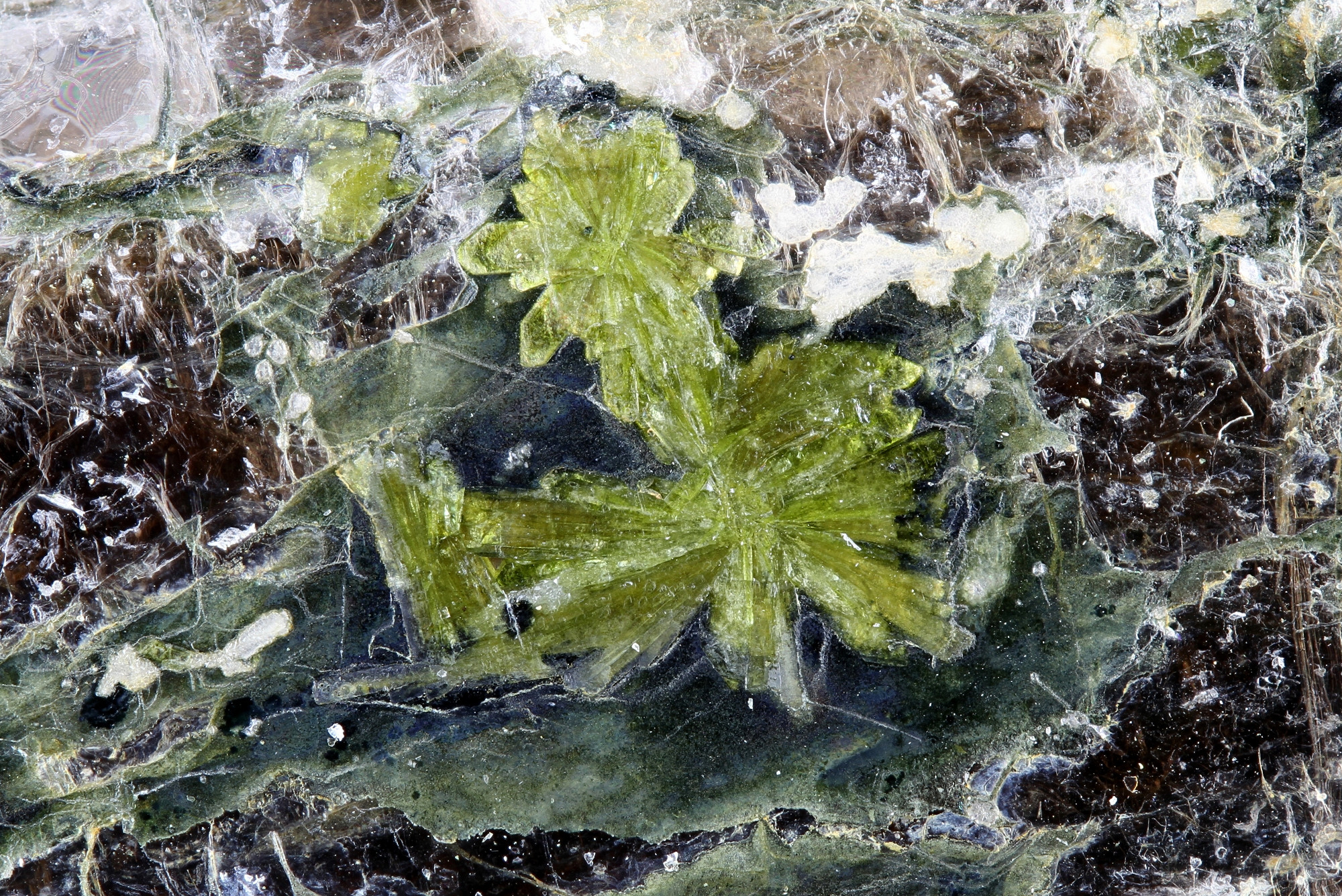und noch was schönes hinterher. Epidotsonnen, eingewachsen in Muskovit von Evje, Norwegen: