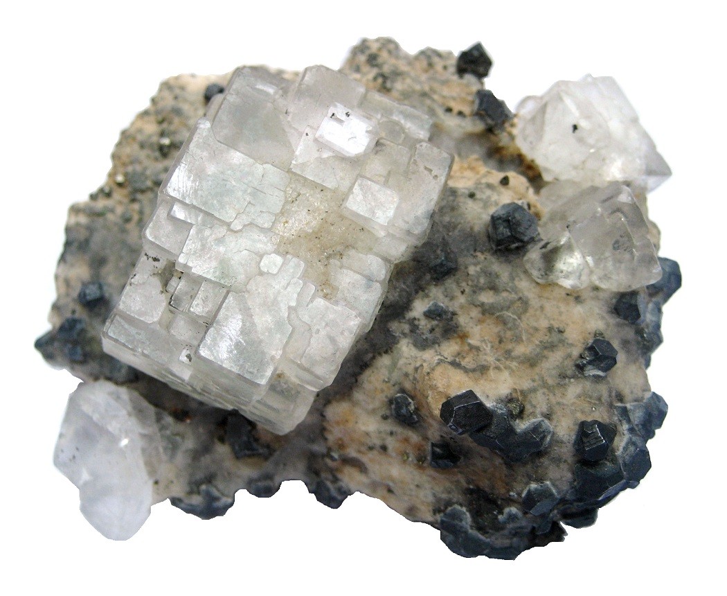 Hier ein Fluorit mit Baryt und Dolomit aus der Grube Tannenboden bei Wieden im Schwarzwald: