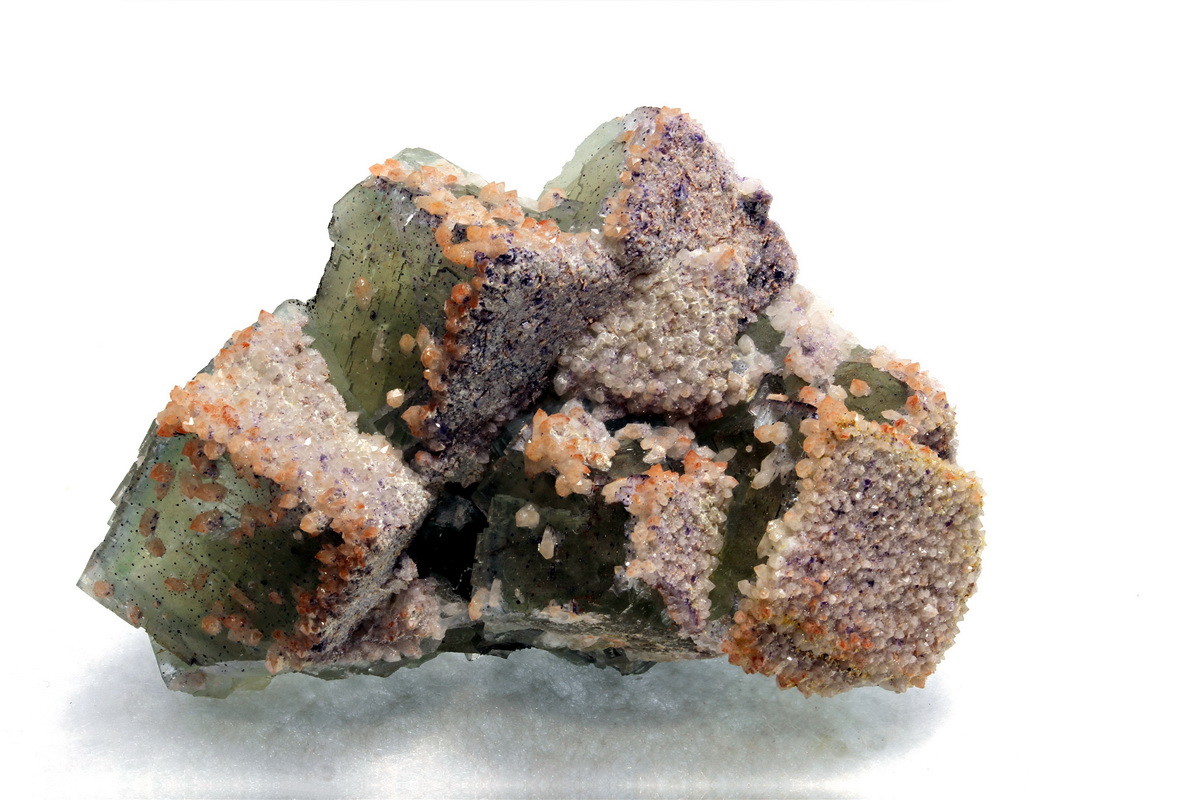 Auf einer Gesteinsmatrix, die ringsum mit winzigen klaren bis milchig weißen Quarz überzogen ist, sitzen hell-violette, scharfkantige Fluorit (bis 10 mm) Einige Flächen des Fluorits sind mit Quarz "überzuckert", was der Stufe ein besonders interessantes Aussehen verleiht. Fundort: Mina La Cabaña, Berbes, Spanien. Stufengröße: 8 x 6 x 2 cm.