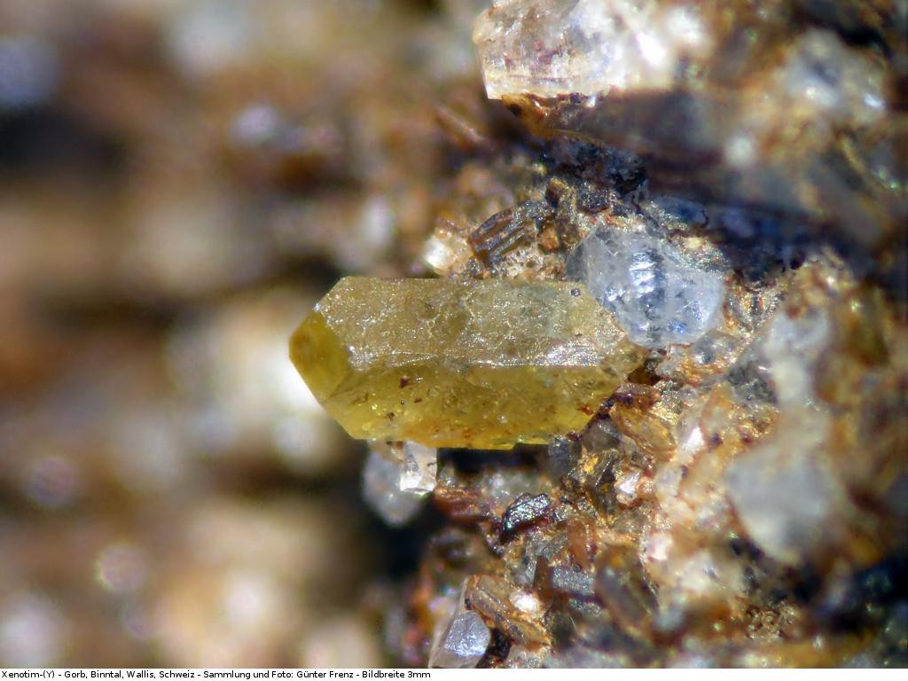 Beispiel: der Xenotim-(Y) vom Gorb im Binntal: Bildbreite 3mm, berechnet aus 5 Einzelbildern (CZM), Kamera Nikon Coolpix P5100 auf Zeiss Stemi 2000.