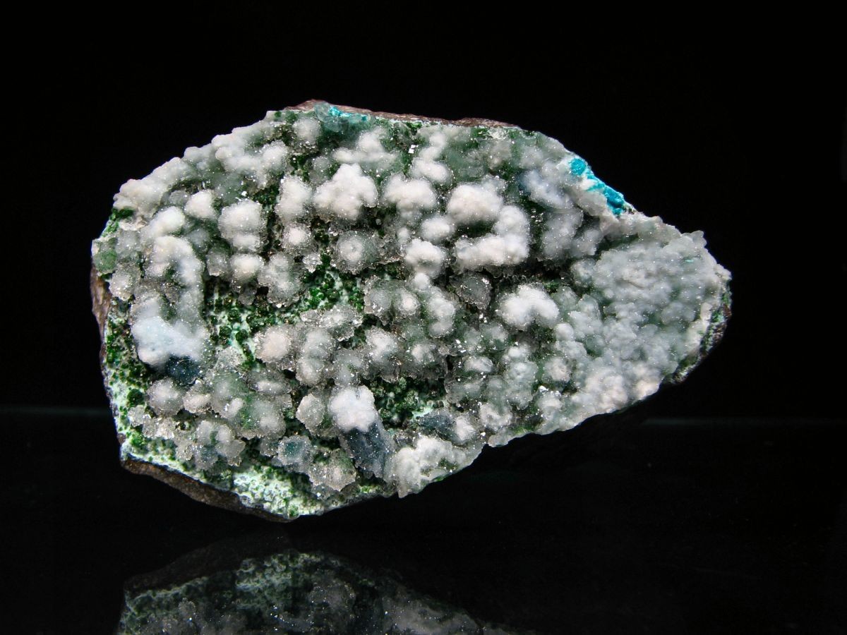 Hier werden kleine Dioptase (kein Atacamit!) mit Quarz bedeckt.