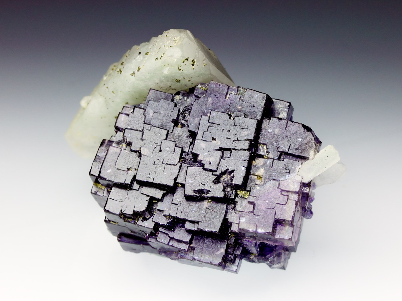 Als Hintergrund nutze ich eine weisse glänzende Plexiglasplatte. Als Lichtquelle habe ich für diese Aufnahmen 4 x 50 W E27 Tageslichtfluoreszenzlampen mit 5400K Farbtemperatur mit einer einfachen Softbox verwendet. Für andere Mineralien als Fluorit, hat sich auch ein einfacher Studioblitz (ebenfalls mit Softbox) bewährt. Vorteil des Blitzes sind noch kürzere Belichtungszeiten und damit noch weniger Bildrauschen. Bei Fluorit hatte ich mit dem Blitz jedoch bei einigen Stufen Probleme mit einer korrekten Farbwiedergabe. Deswegen hier die Tageslichtleuchte.