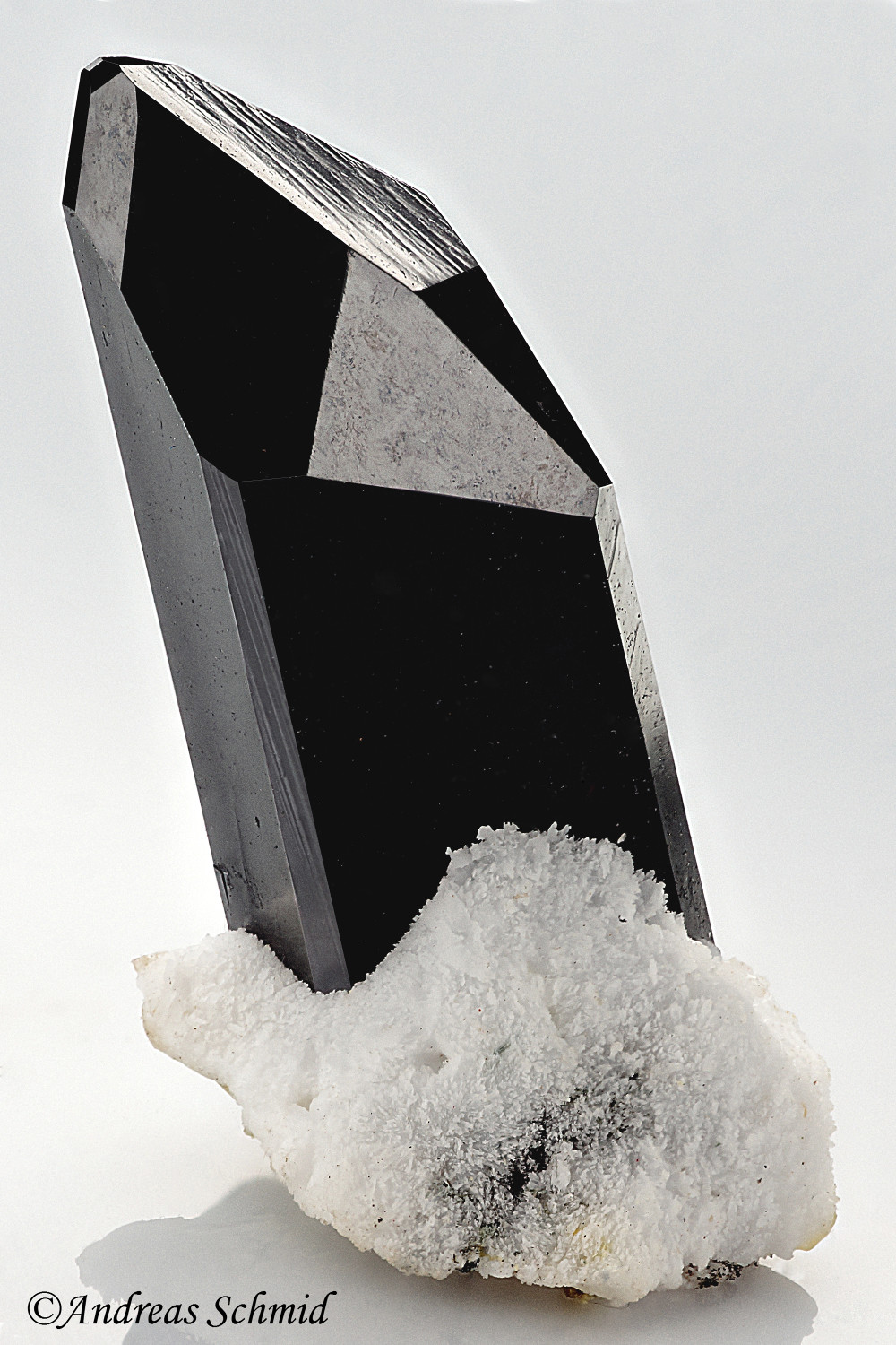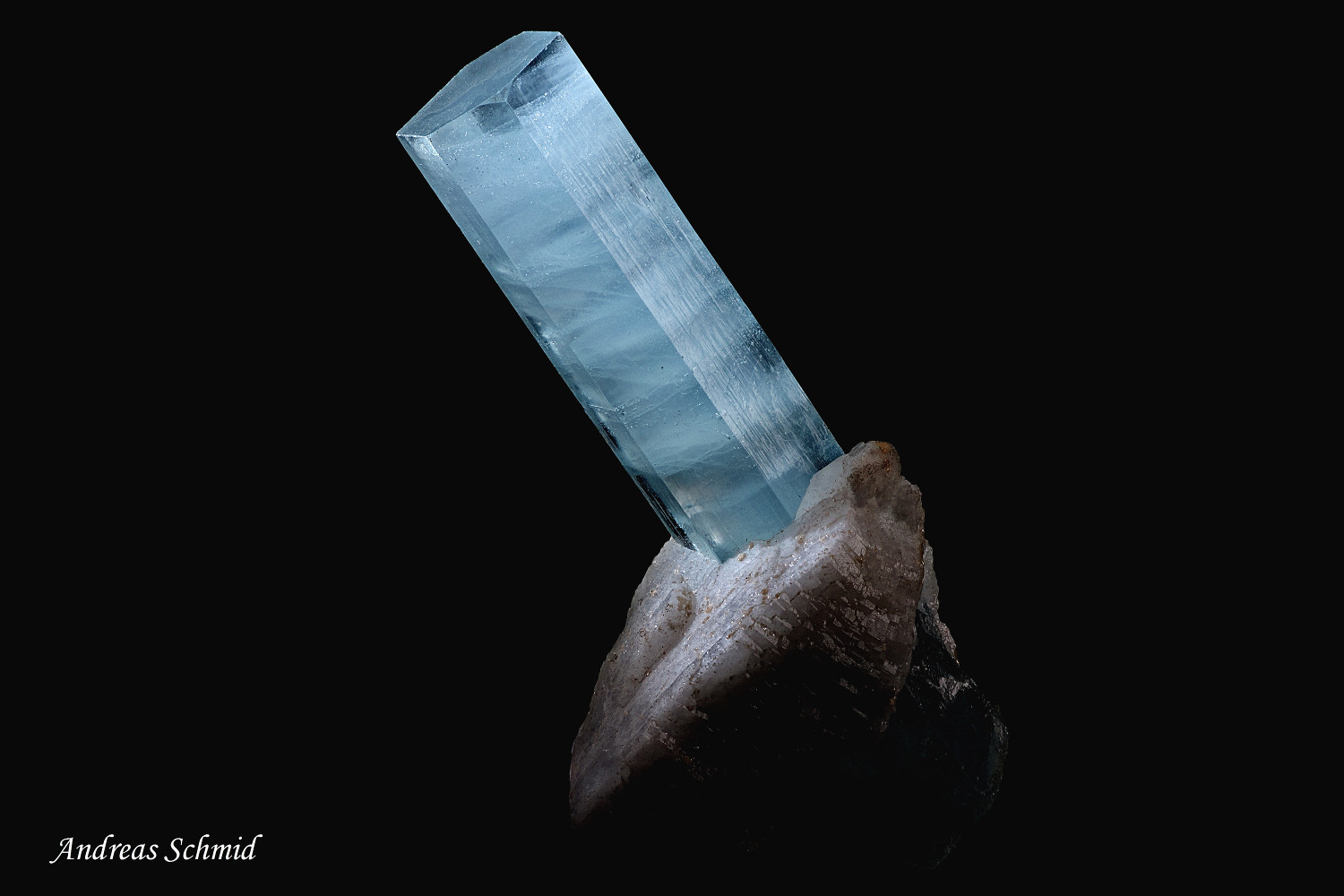 1. Beryllkristall, ca. 4cm x 1.5cm, auf Rauchquarz; Gefunden in Iveland (Norwegen).