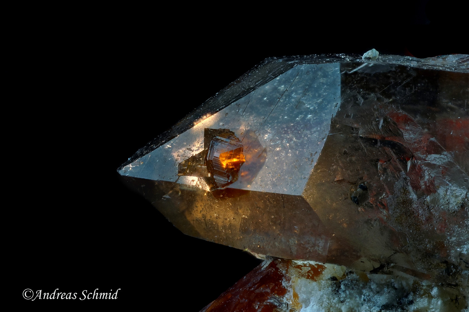 2. Rauchquarzkristall 2cm mit Orthoklas; Gefunden im Hurumgebiet in Norwegen.
