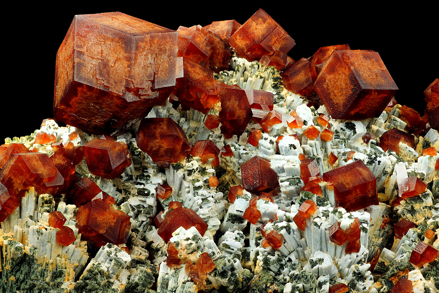 1. Granat (Spessartin) ca.7mm mit Hornblende; Gefunden bei Trondheim (Norwegen).