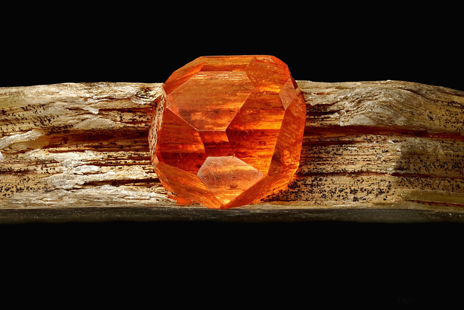 Zweifellos ein hervorragender Spessartin. Allerdings frage ich mich, wie dieser Kristall auf die Seitenflächen des Muskovites kommt und wie es gelungen ist, diesen an dieser Stelle so schön frei zu legen. Ich sehe auch keine Anzeichen einer Kluftbildung rechts und links des Kristalles. Ich will ja nicht die Natürlichkeit der Stufe anzweifeln, aber merkwürdig ist das schon.