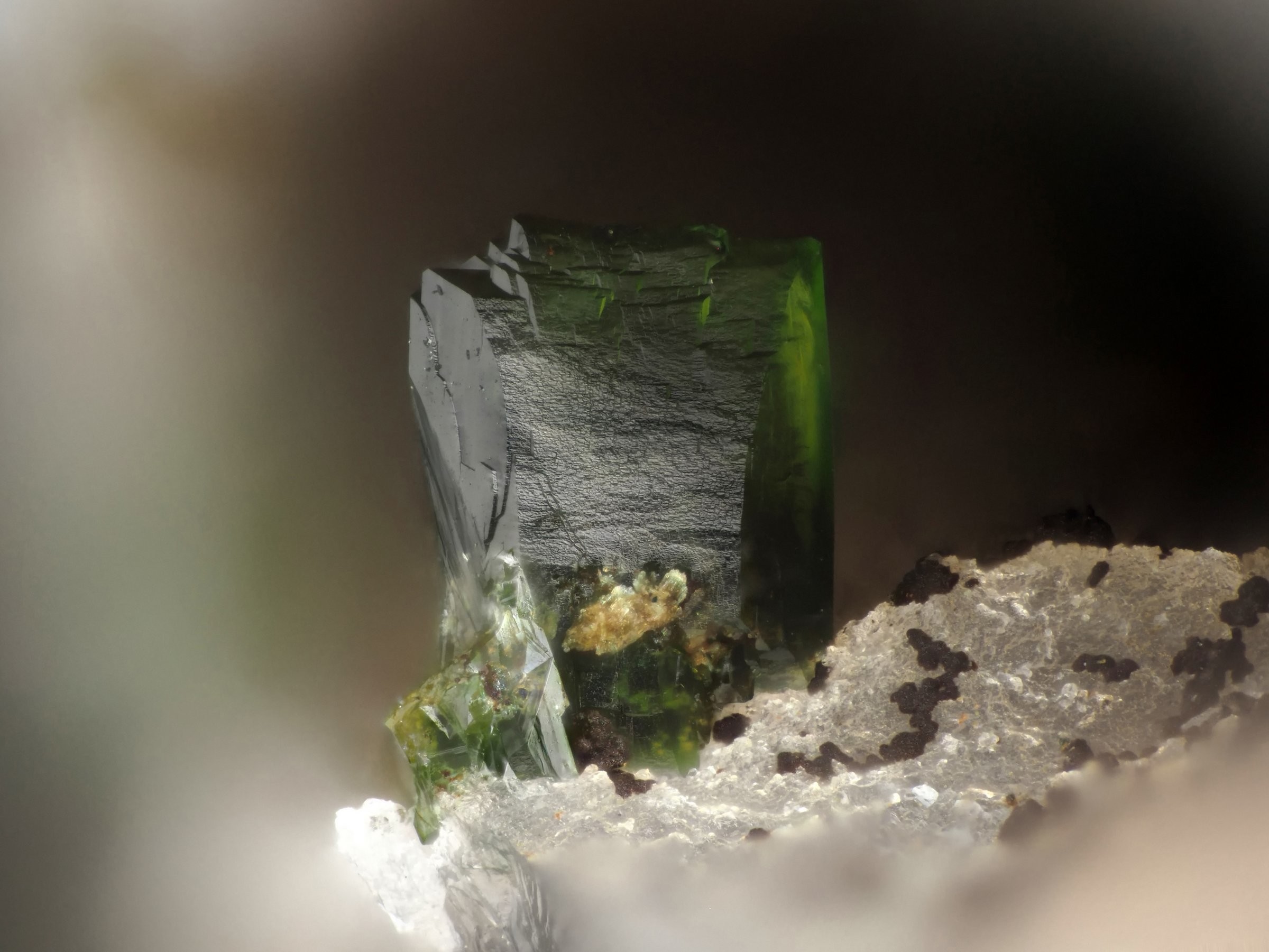 eine "besondere Rarität" wie im Buch von Kastning und Schlüter erwähnt, Libethenit gestreckt, leicht keilförmig von Haggendorf-Süd: