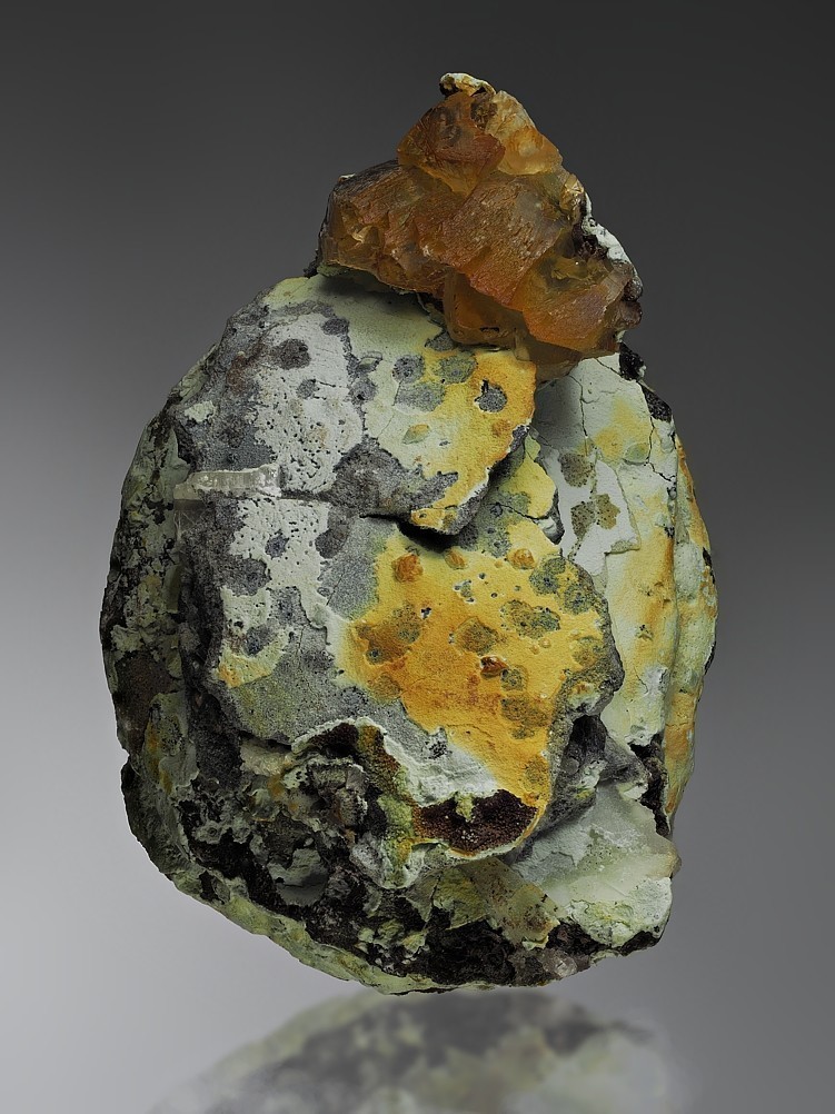 pseudokubische, gelbe Eisenkiesel mit Hämatit. Vom FO Kallenhardt, im Sauerland. Ein Fund von 1978.