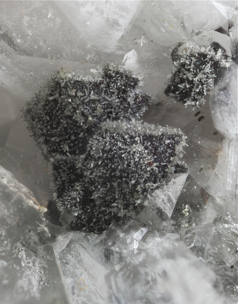 ich habe hier Millerit mit Calcit von der Grube Dörnberg, Willibaldstollen 120m-Sohle, Bildbreite 15 mm