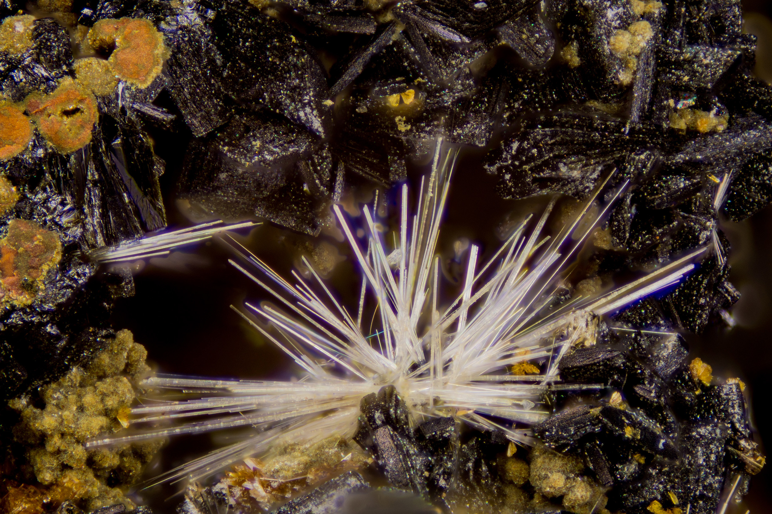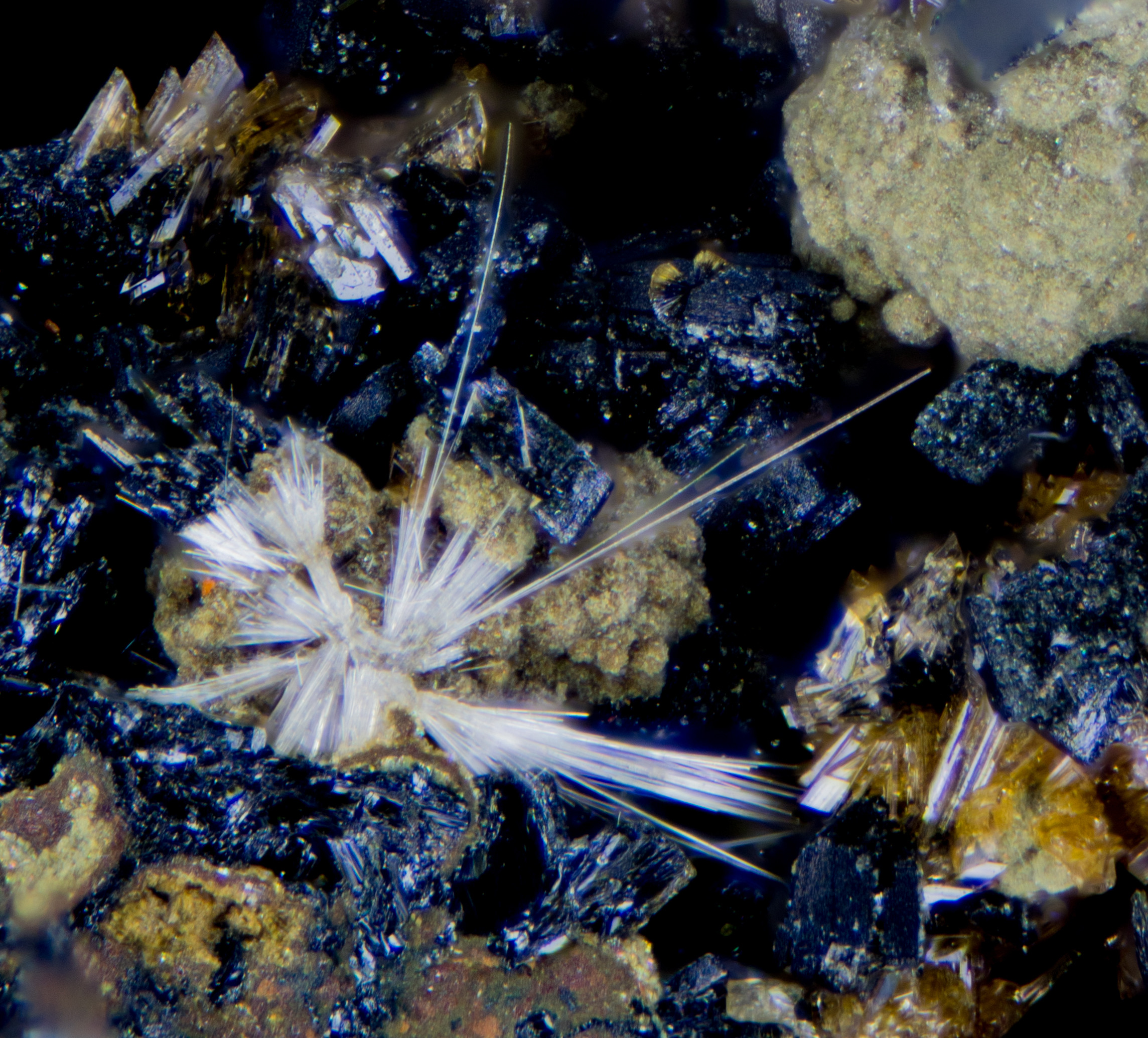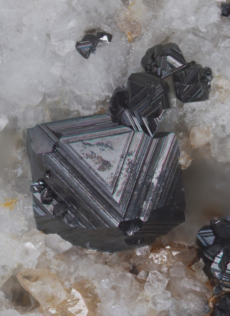 Die Rhomboeder dürften Arsenopyrite sein (typisch mit Durchdringunszwillinge)