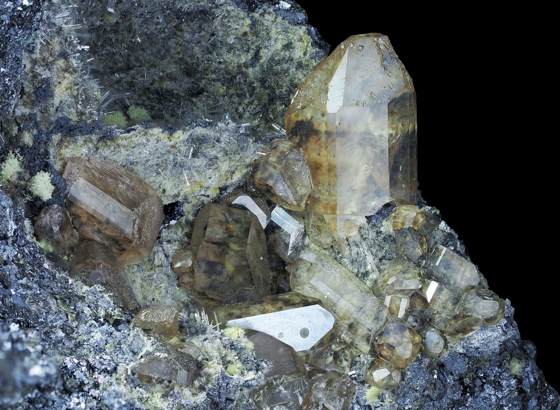 Es ist verblüffend, welche unterschiedlichen Kristallformen Zinkblende am Lengenbach ausbildet. Zudem sind die Kristalle meist eisenarm und deshalb auch schön hell und transparent. Die rundlichen Formen finden sich am Lengenbach immer wieder und stellen Wachstumsformen, keine Auflösungserscheinungen - wie etwa bei rundlichen Diamanten - dar. Es gibt dort auch Auflösungsformen - diese wirken dann aber meist zerfetzt und angeknabbert.