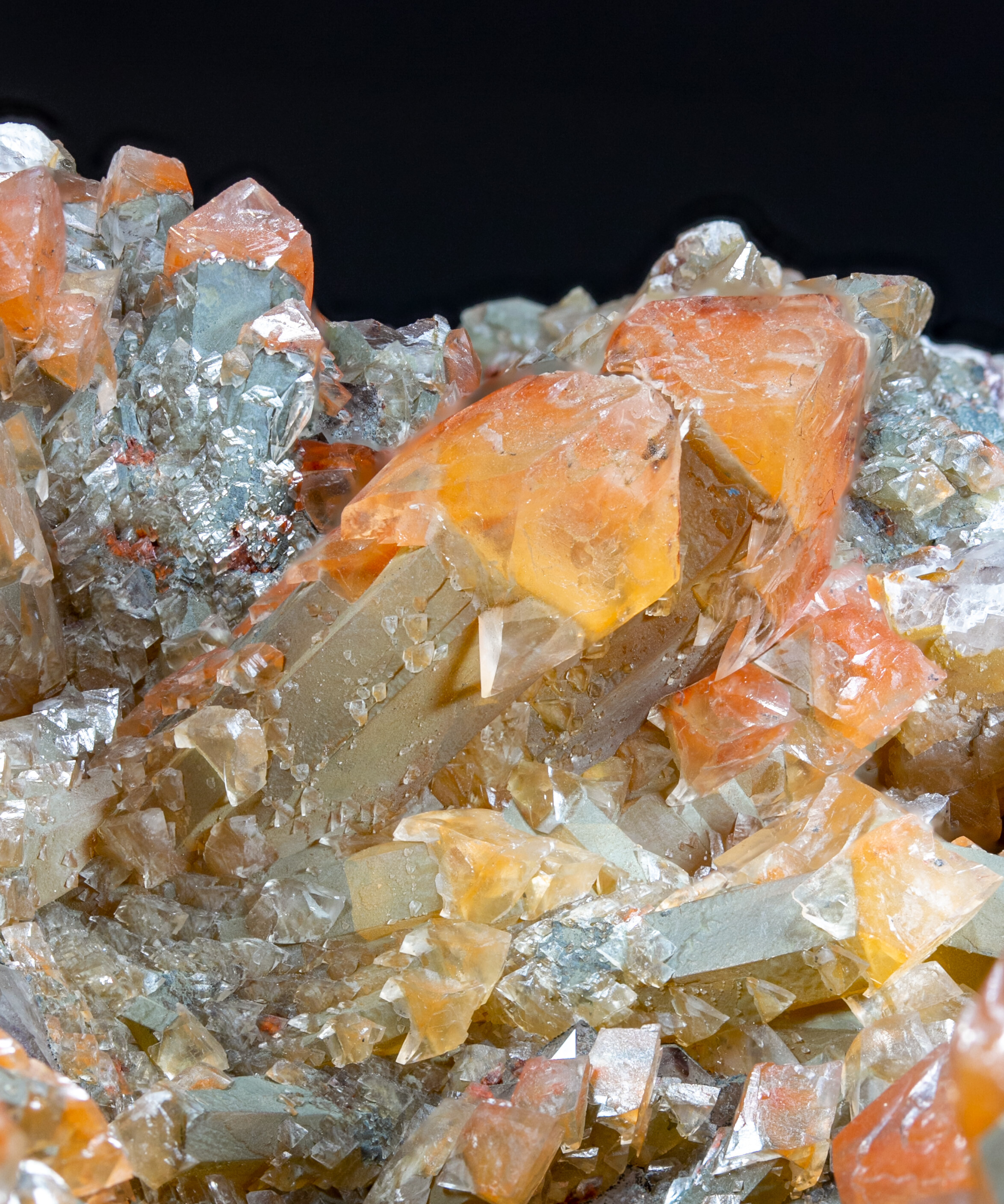 Pyromorphit-Mimetesit-Serie auf, von einer dünnen Fe-Oxidschicht überzogen)