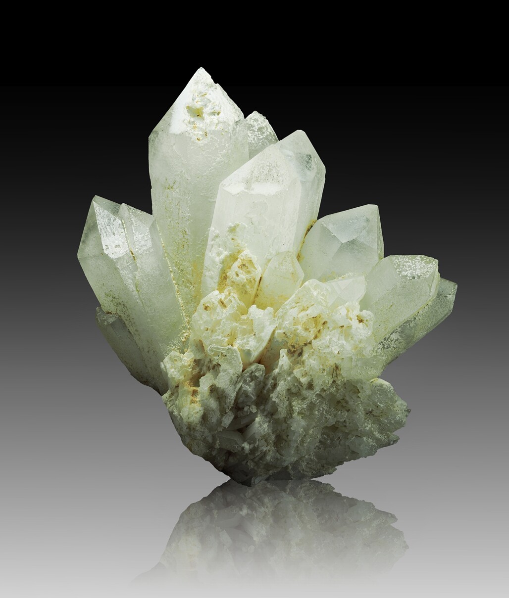 Fotografiert werden die Stücke von mir zum Teil in ihrer Montage in einer Stülpdeckeldose oder bei größeren Stücken in einer Schale mit Reis, was ihre Ausrichtung zur Kamera ermöglicht. Ich möchte dem Betrachter aber diesen unruhigen, verwirrenden und nicht gerade hilfreichen Hintergrund ersparen. Daher schneide ich die Stufen mit einer Maske aus und setze ich die Stücke vor einen digital erzeugten und individuell angepassten, von hell nach dunkel verlaufenden Hintergrund, der den Stücken einen dreidimensional erfahrbaren Raum bietet. Ich habe mich bewusst für diesen nur in Grauwerten gehaltenen Hintergrund entschieden. Farbig kontrastierende Hintergründe nehmen den Mineralien mehr als sie ihnen geben.