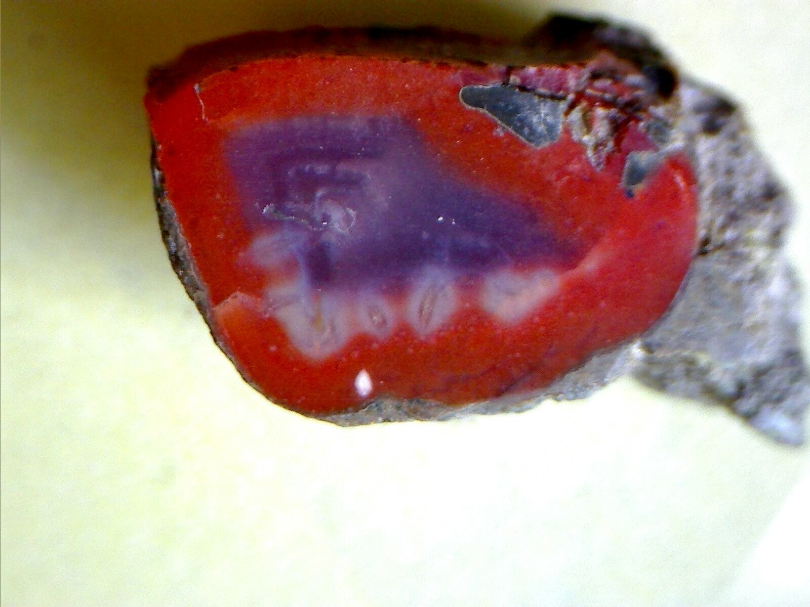das Bild ist zudem nicht scharf, nicht zentriert und vor allem sind die Farben zu stark saturiert. Gerade die sollen ja das Besondere an diesem Achat sein.