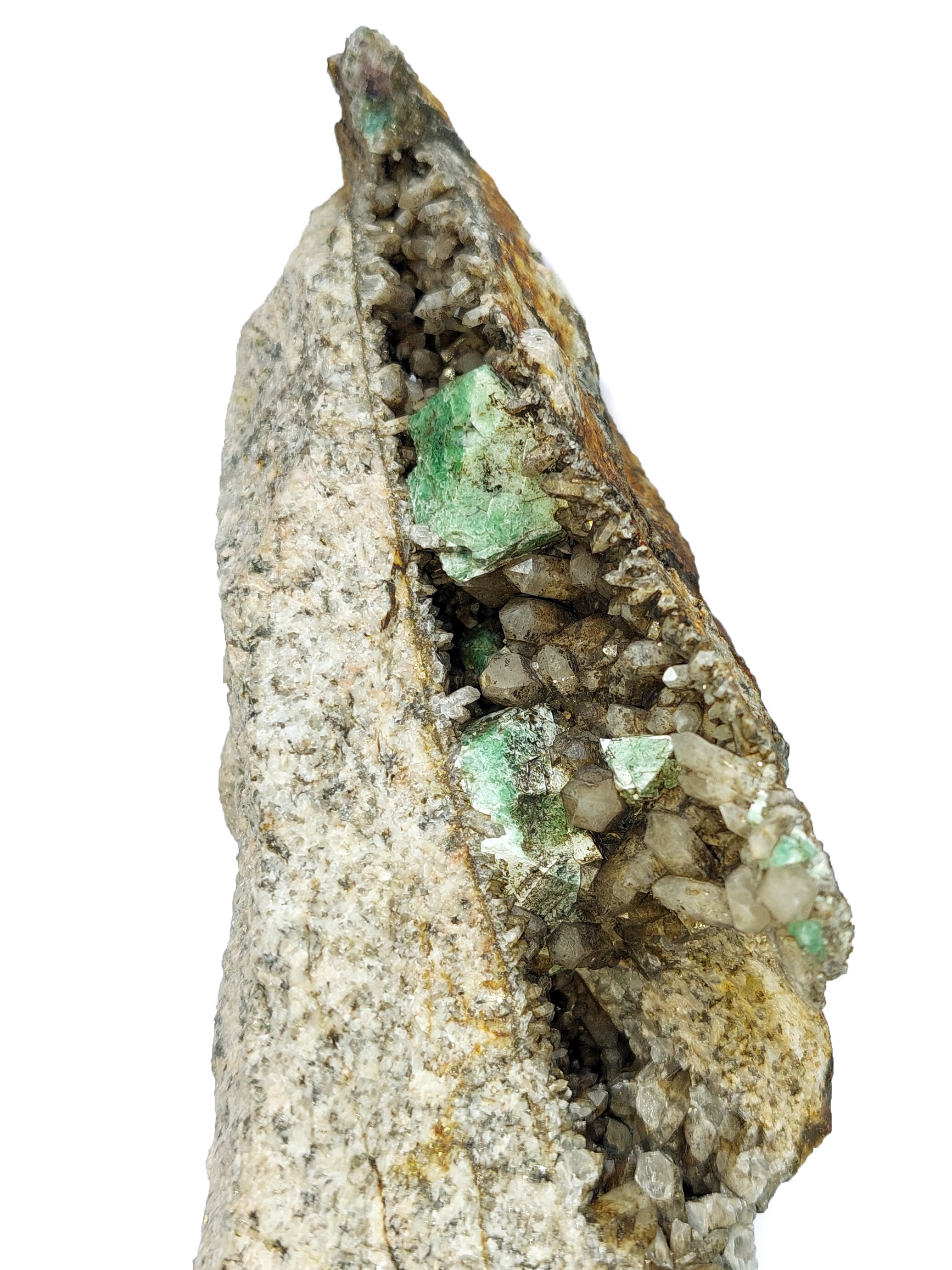 Das Stück ist ein relativ neuer Fund. Leider - das stimmt - sind die Kristalle nicht frei von Beschädigungen. Die für den Fundort ungewöhnliche grüne Farbe und die Größe (großer Oktaeder immerhin 1,7 cm) haben mich aber dennoch dazu bewogen, das Stück im Atlas zu zeigen. Sie können aber versichert sein, dass ich in der Lage bin, Fluorit und Torbernit voneinander zu unterscheiden. Es handelt sich ohne jeden Zweifel um Fluorit. Torbernit spielt bei dieser Stufe keine Rolle.