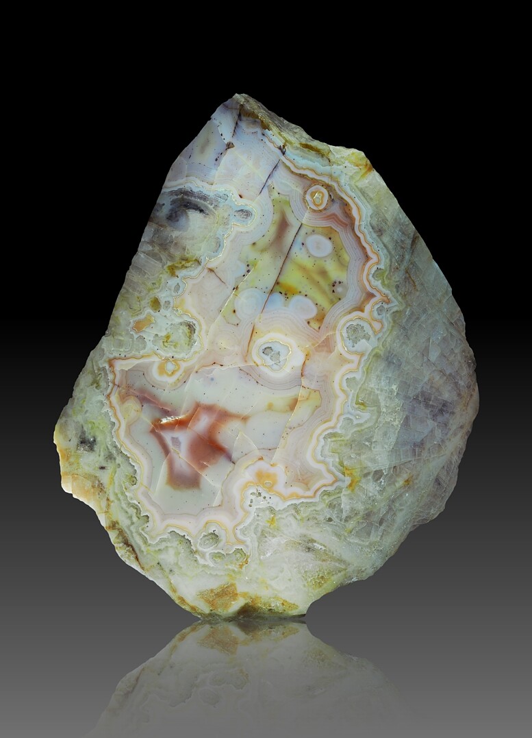 Ich habe diesen Achat nicht selbst gefunden, aber er Achat sitzt auf einer "claratypischen" Matrix aus Baryt und wenig Quarz. Drehte ich das Stück um und würde es auf die Barythalde der Sachtleben legen, würdest du es nicht von den anderen Brocken unterscheiden können. Ungewöhnlich erscheint dir vielleicht das große Bild. Der Achat wurde als schmaler Gangachat gefunden und parallel zur Gangrichtung gesägt (wir sagen hier "Sauschnitt" dazu) um eben das größtmögliche Bild zu erhalten.