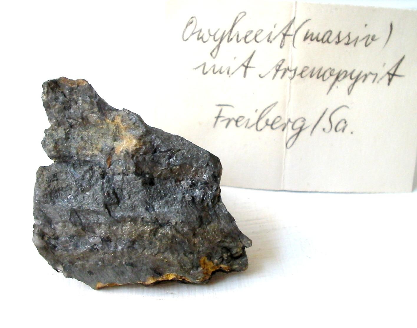 Weiter mit Bräunsdorf-Diskussionen... Owyheeit ist mir von Bräunsdorf bisher nur als Jamesonit-artiges "Federerz" in Quarzdrusen untergekommen. In derart dichter Ausbildung ist er mir bisher nur von Himmelsfürst, in Paragenese mit kleinsten Freieslebeniten, bekannt. Auf dem Etikett steht nur "Freiberg/Sa." - deshalb die Frage: wie sieht der Arsenopyrit aus? Die Kristallformen aus den Brander und Bräunsdorfer Gängen zeigen ja eigentlich markante Unterschiede.