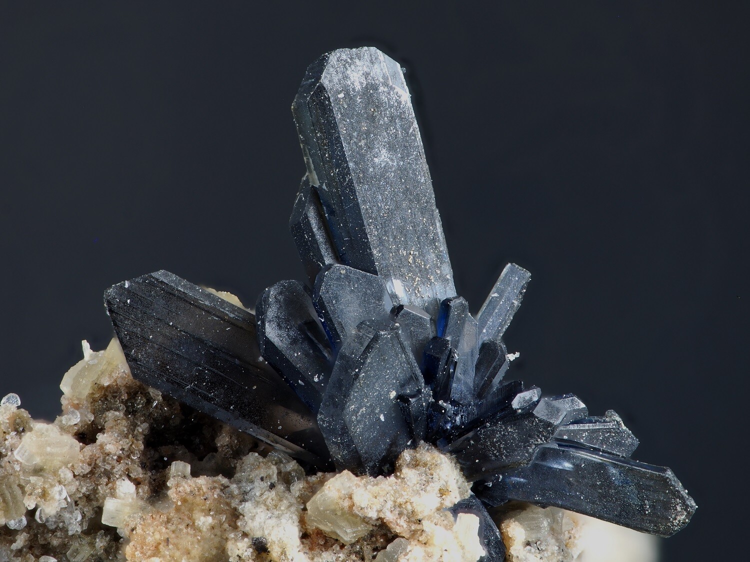 Ich bezweifele, dass es sich bei diesen Kristallen um Vivianit handelt. Der Form fehlt jeder monokline Aspekt. Einen deutlichen Dichroismus kann ich auch nicht erkennen. Ich halte das Mineral für Azurit. Die Matrix mit kleinen Karbonatrhomboedern spricht ebenso, wie die Größe und Qualität der vermeintlichen Vivianite, gegen den Fundort Nickenicher Sattelberg.