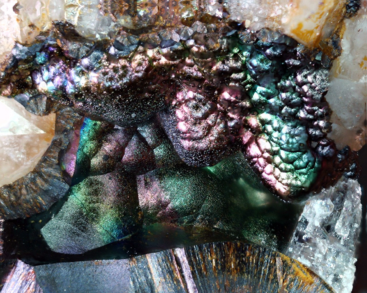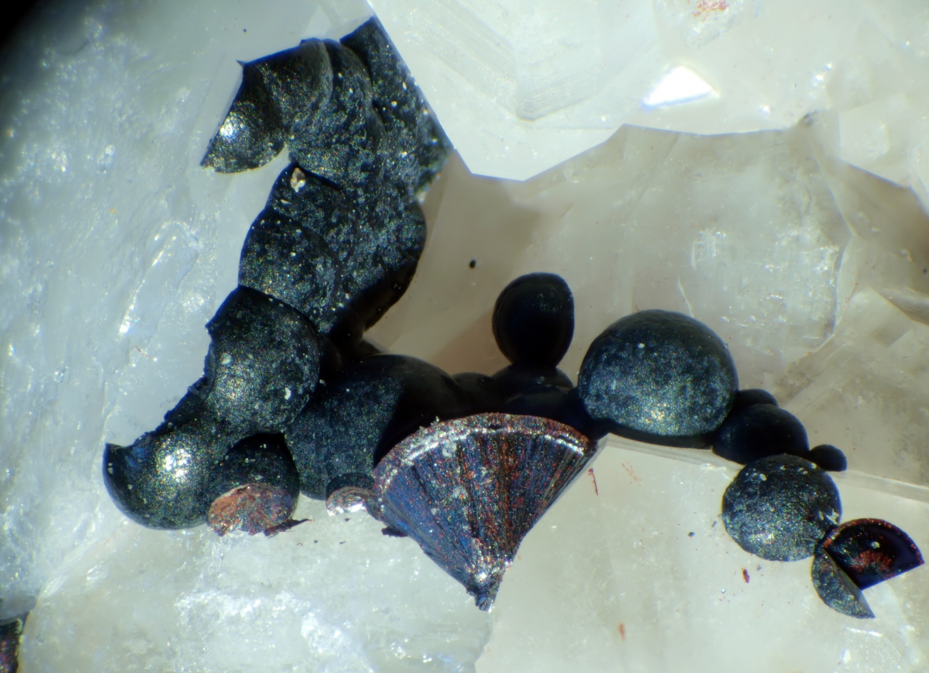 Habe ein Bild von Frank Schimak auf mindat in Erinnerung, das farblos-weiße konzentrischschalige Pusteln von Calcit zeigt.